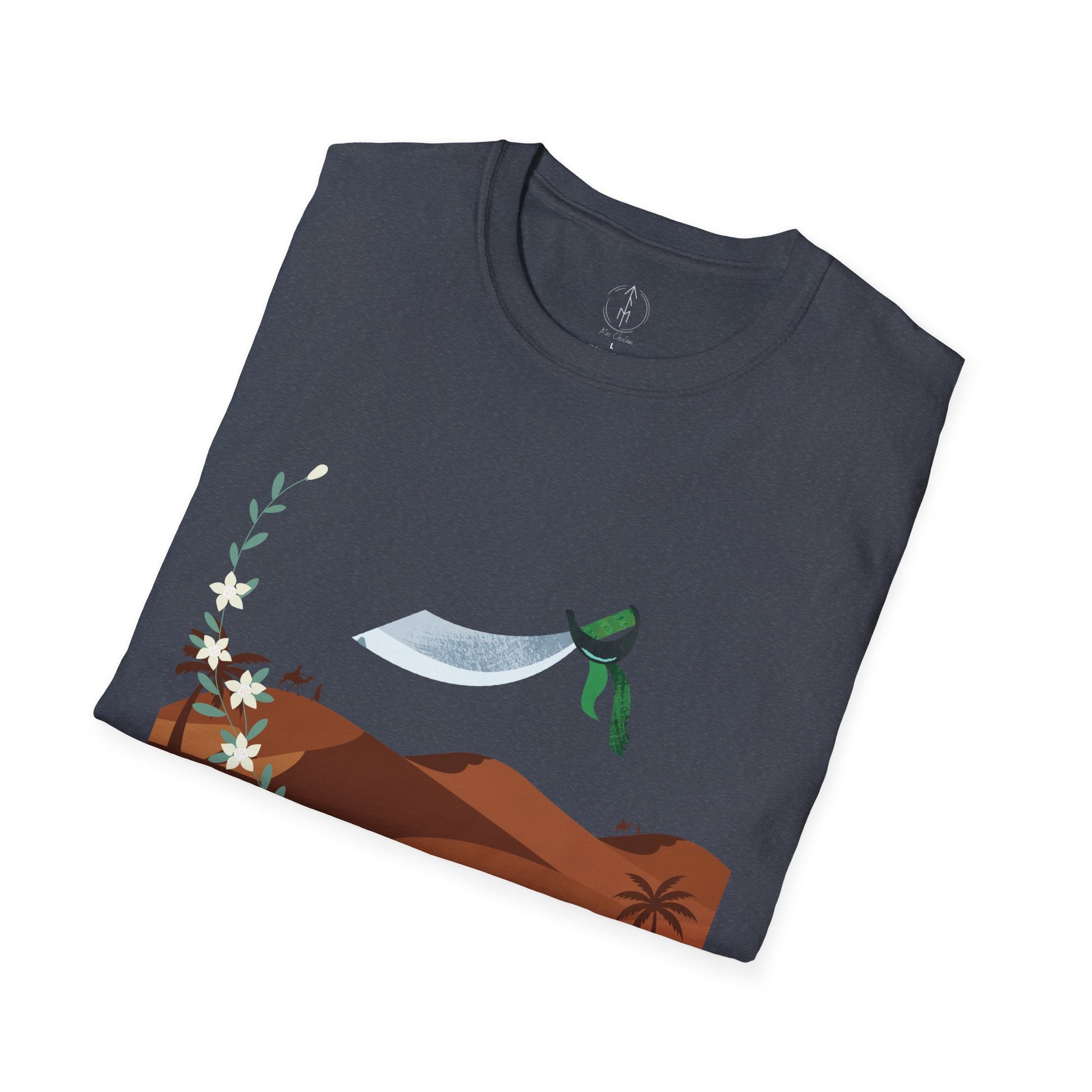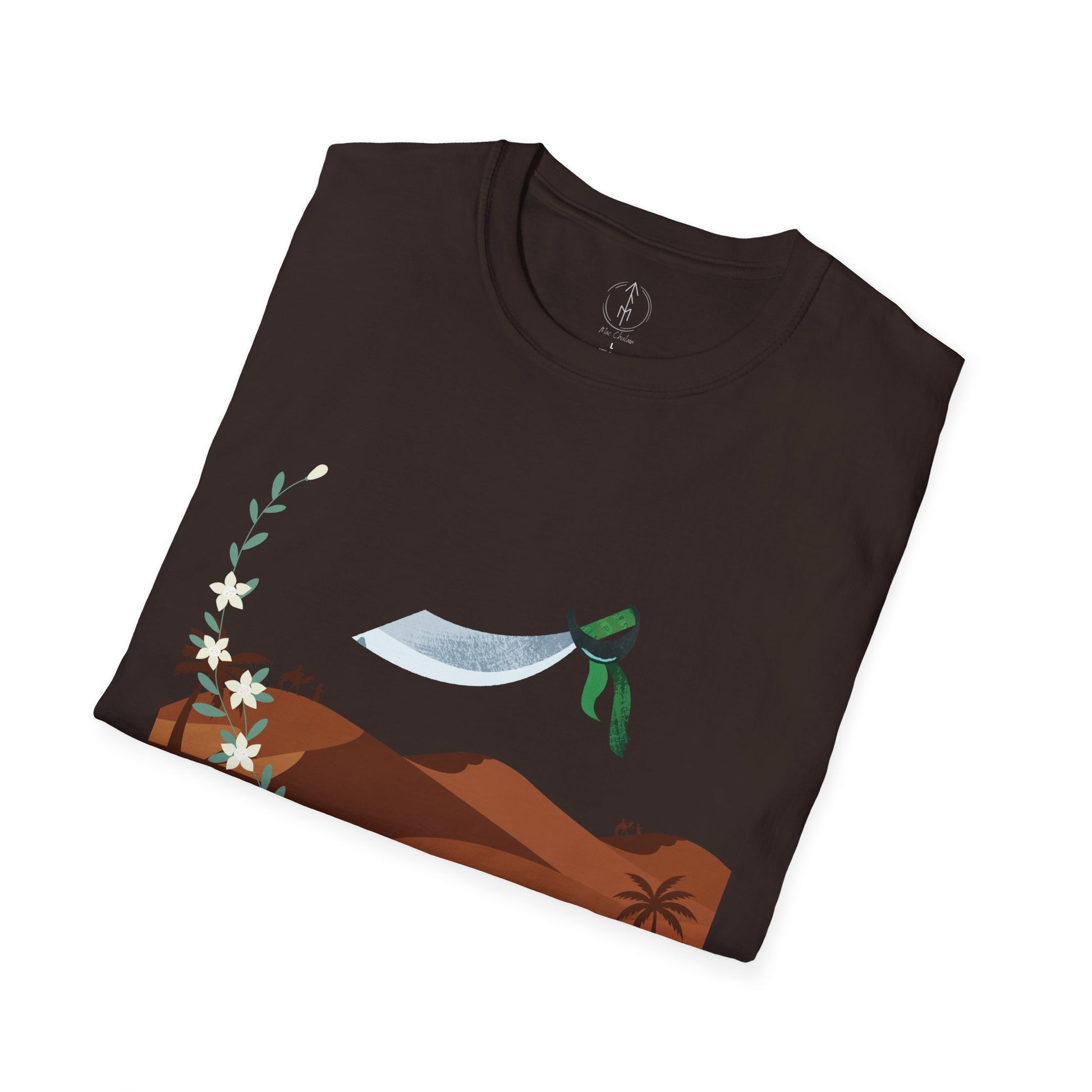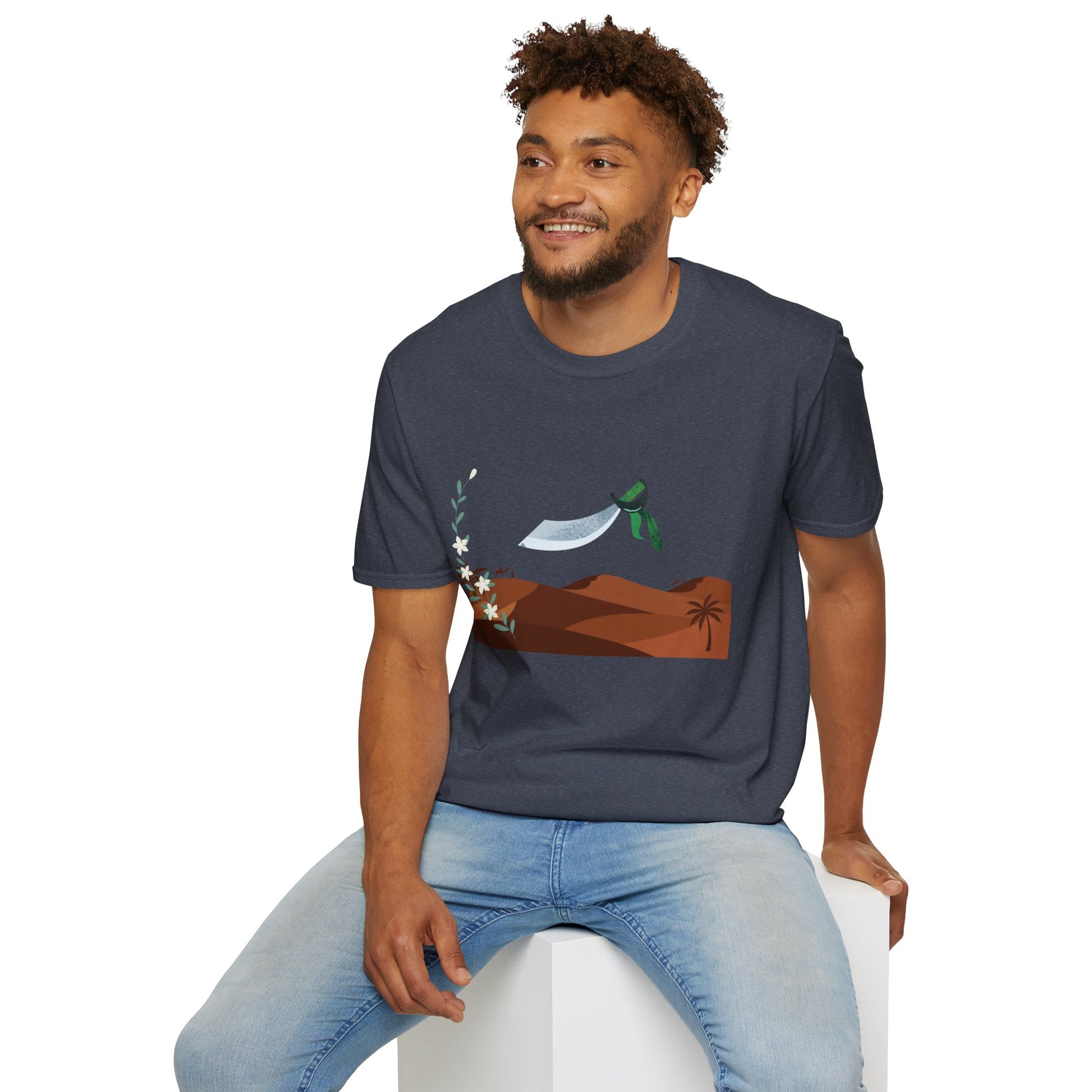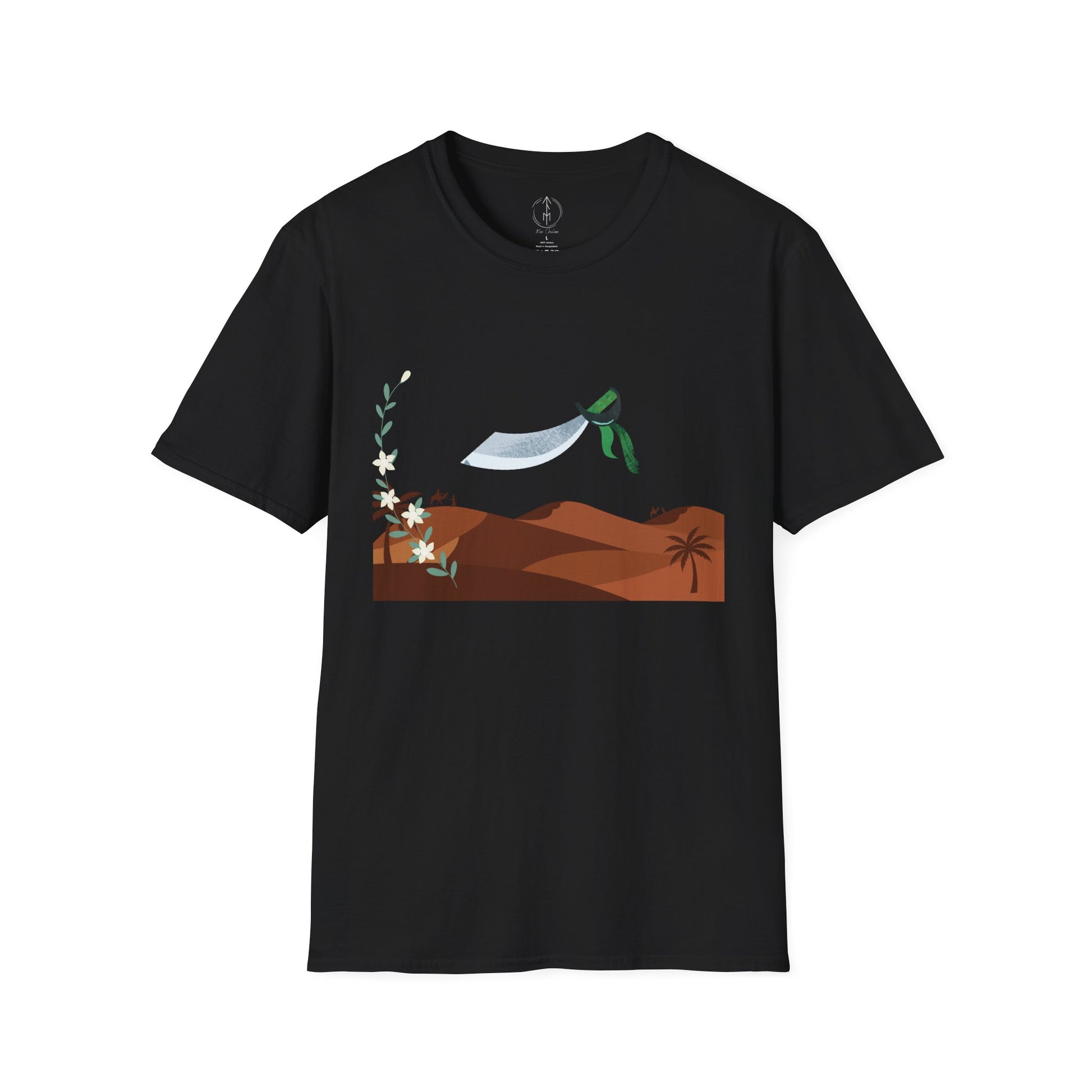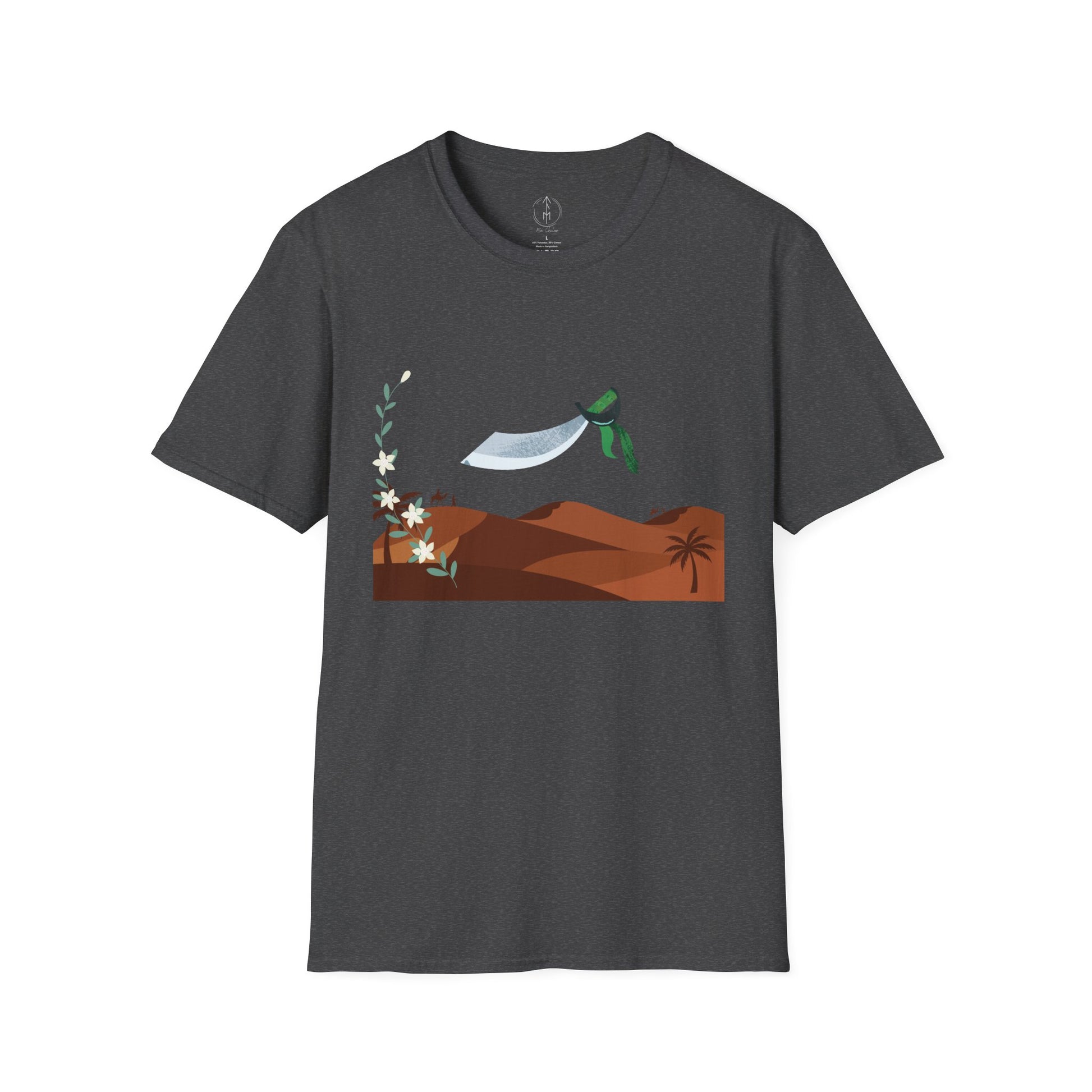 A part of the warrior-poet collection. In honor of the fabled Arabian warriors who once roamed the desert sands, this soft crewneck tee features the famed alfanje scimitar sword and coffea arabica flowers. Crafted from 100% ring-spun cotton, it offers a lightweight and blissful wearing experience for all-day comfort. The classic fit and crew neckline make it suitable for both casual outings and semi-formal events, allowing you to easily style it with your favorite jeans or skirts. Perfect for anyone who values comfort, quality, and style, this T-Shirt is especially relevant during holidays and celebrations like casual family gatherings, summer festivals, or just enjoying a relaxed day at home. Whether you're gifting it to a loved one or treating yourself, it embodies a laid-back yet chic vibe that fits seamlessly into any wardrobe.