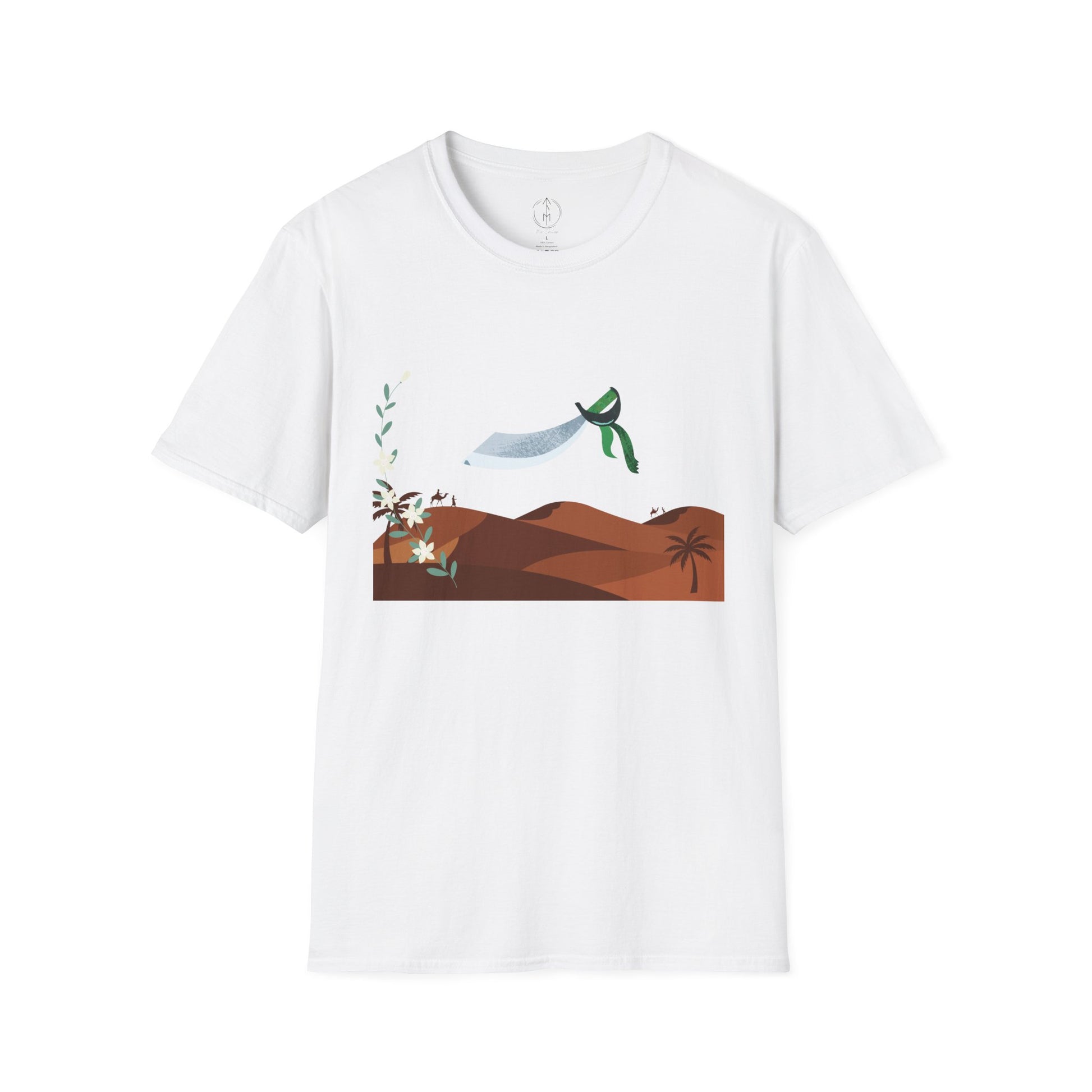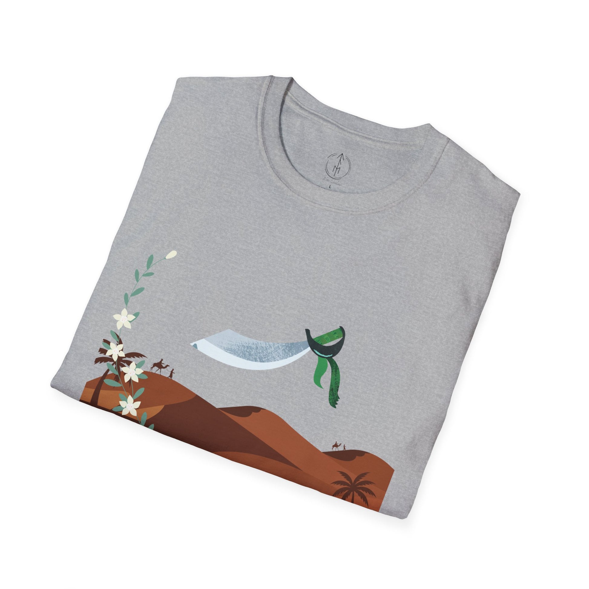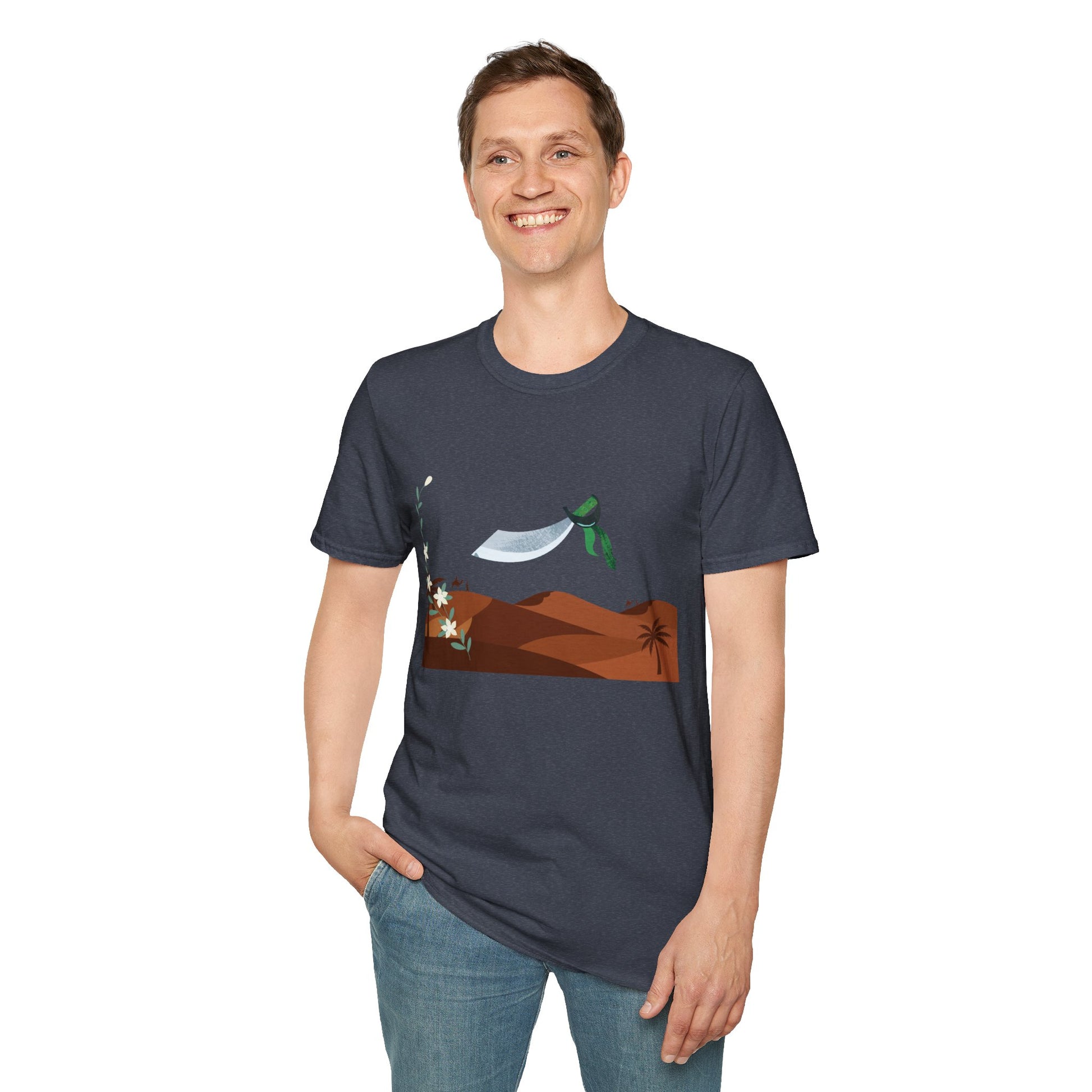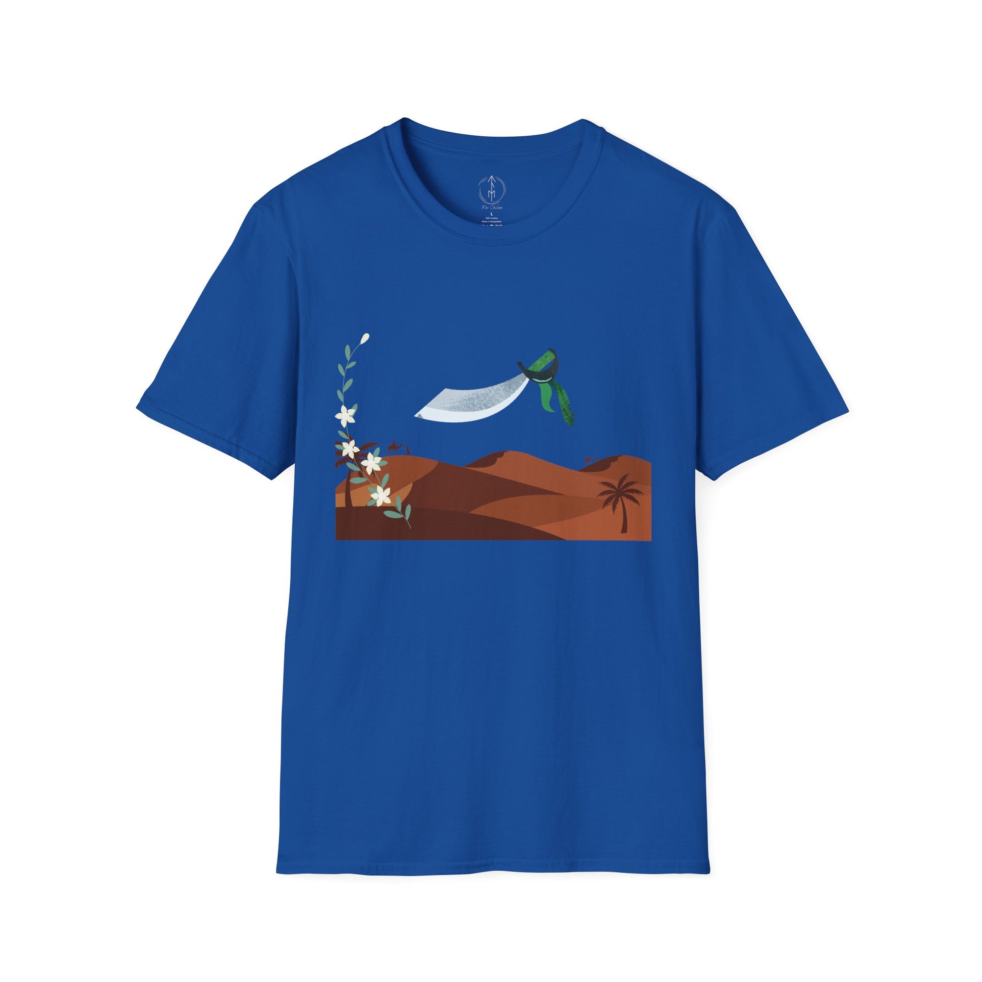 A part of the warrior-poet collection. In honor of the fabled Arabian warriors who once roamed the desert sands, this soft crewneck tee features the famed alfanje scimitar sword and coffea arabica flowers. Crafted from 100% ring-spun cotton, it offers a lightweight and blissful wearing experience for all-day comfort. The classic fit and crew neckline make it suitable for both casual outings and semi-formal events, allowing you to easily style it with your favorite jeans or skirts. Perfect for anyone who values comfort, quality, and style, this T-Shirt is especially relevant during holidays and celebrations like casual family gatherings, summer festivals, or just enjoying a relaxed day at home. Whether you're gifting it to a loved one or treating yourself, it embodies a laid-back yet chic vibe that fits seamlessly into any wardrobe.