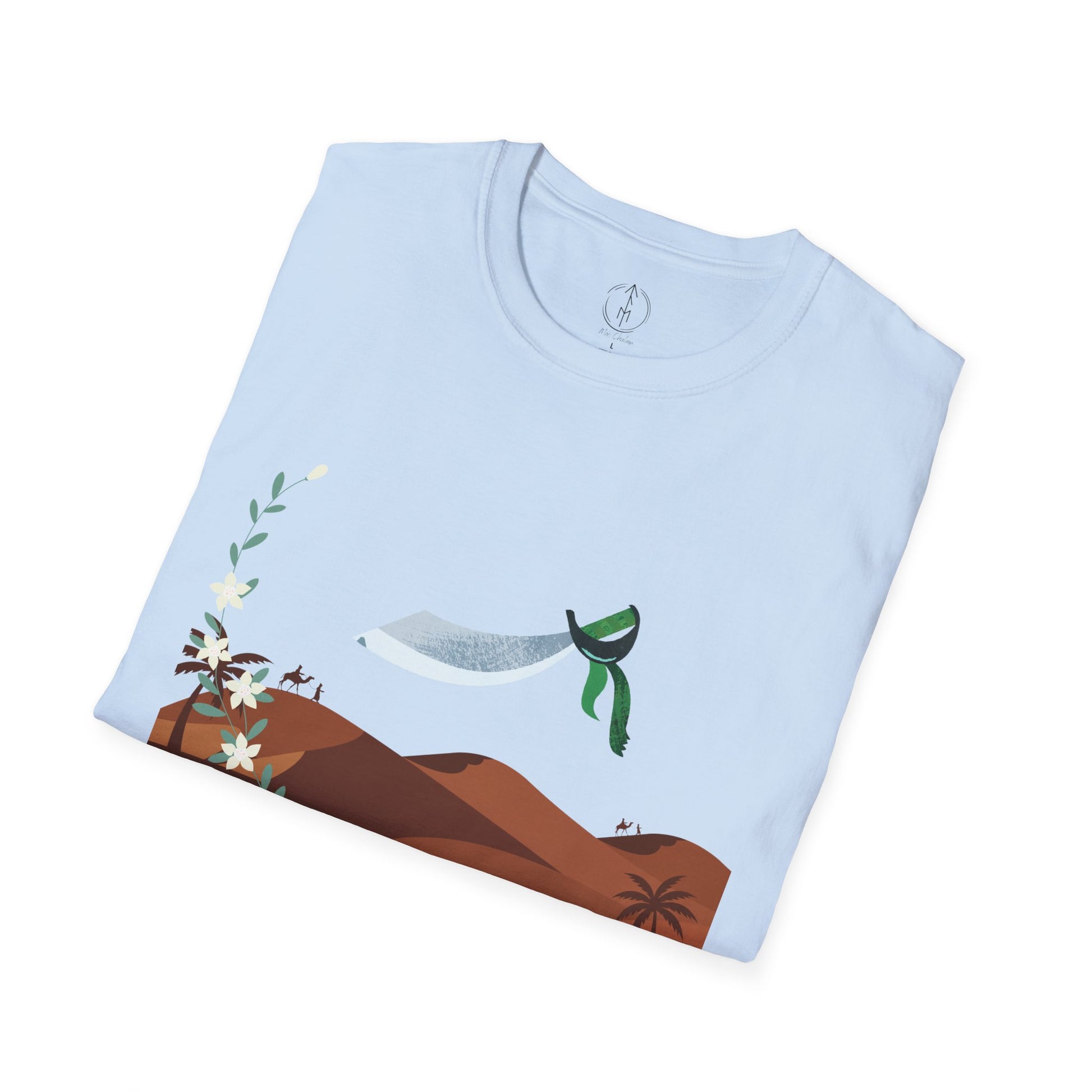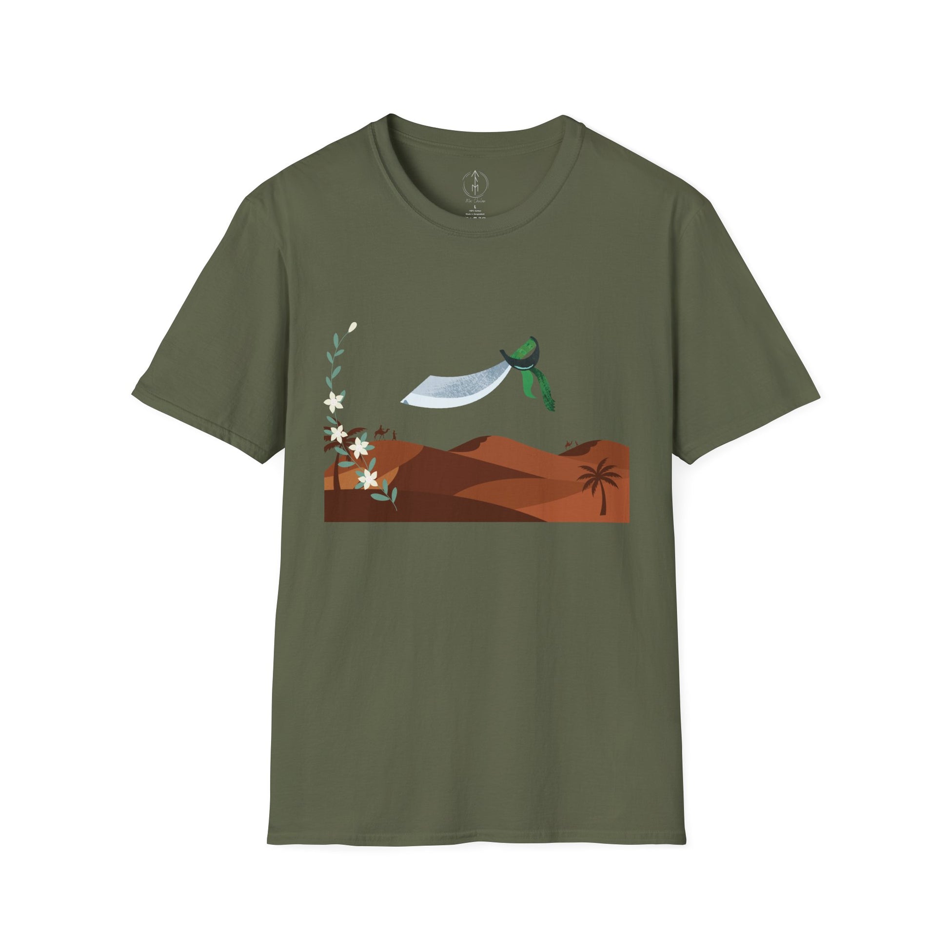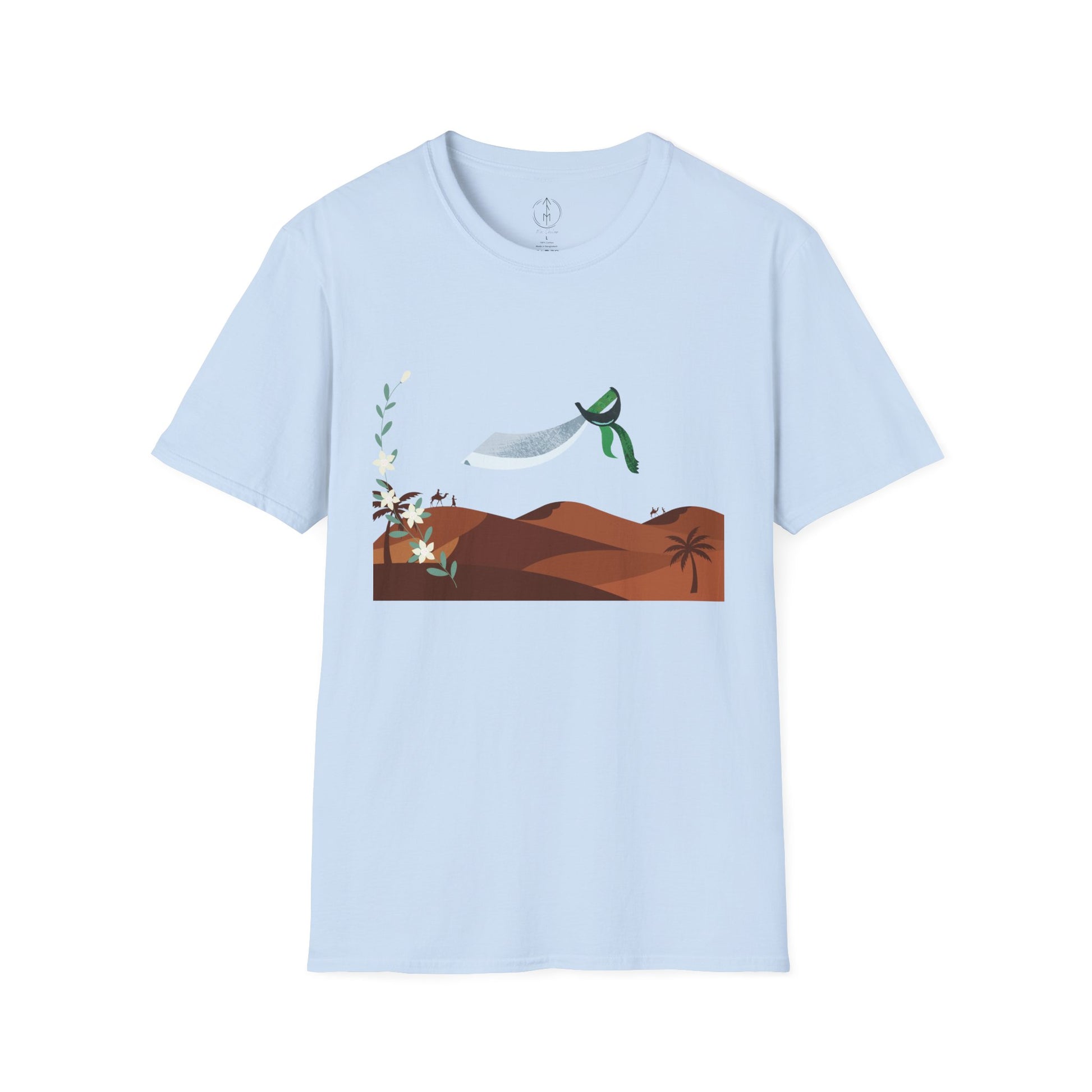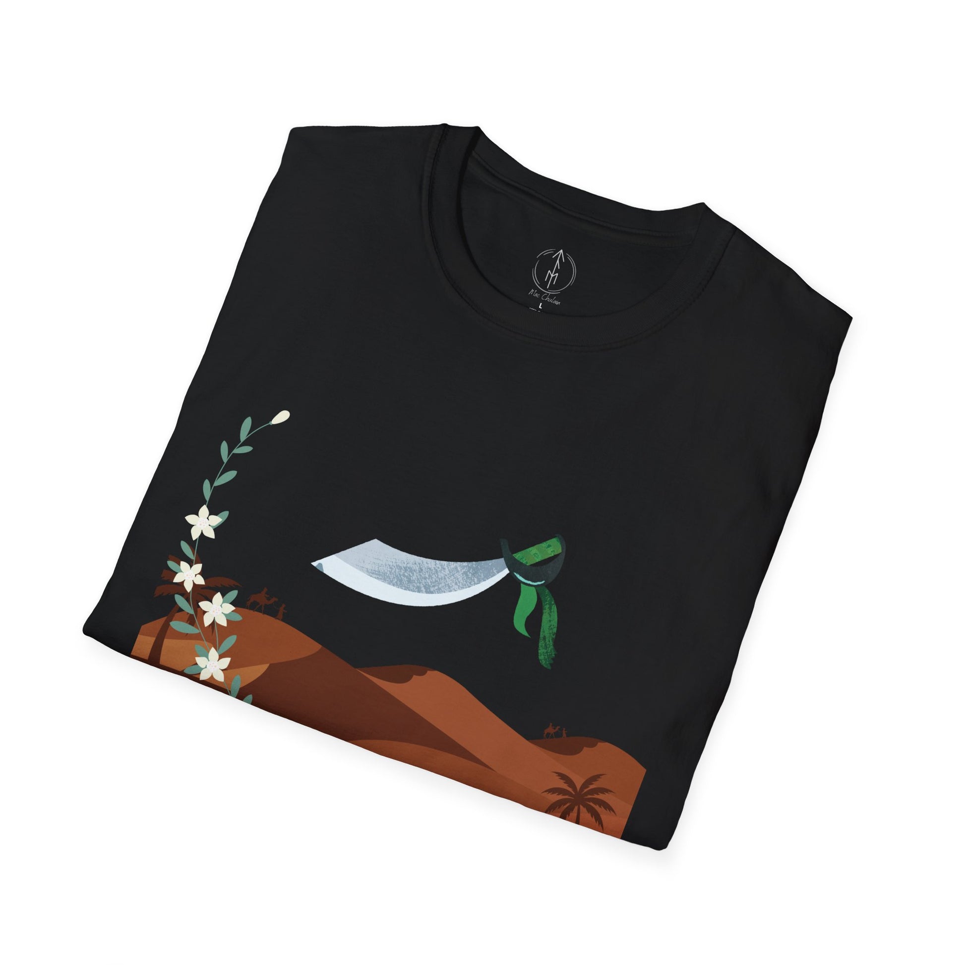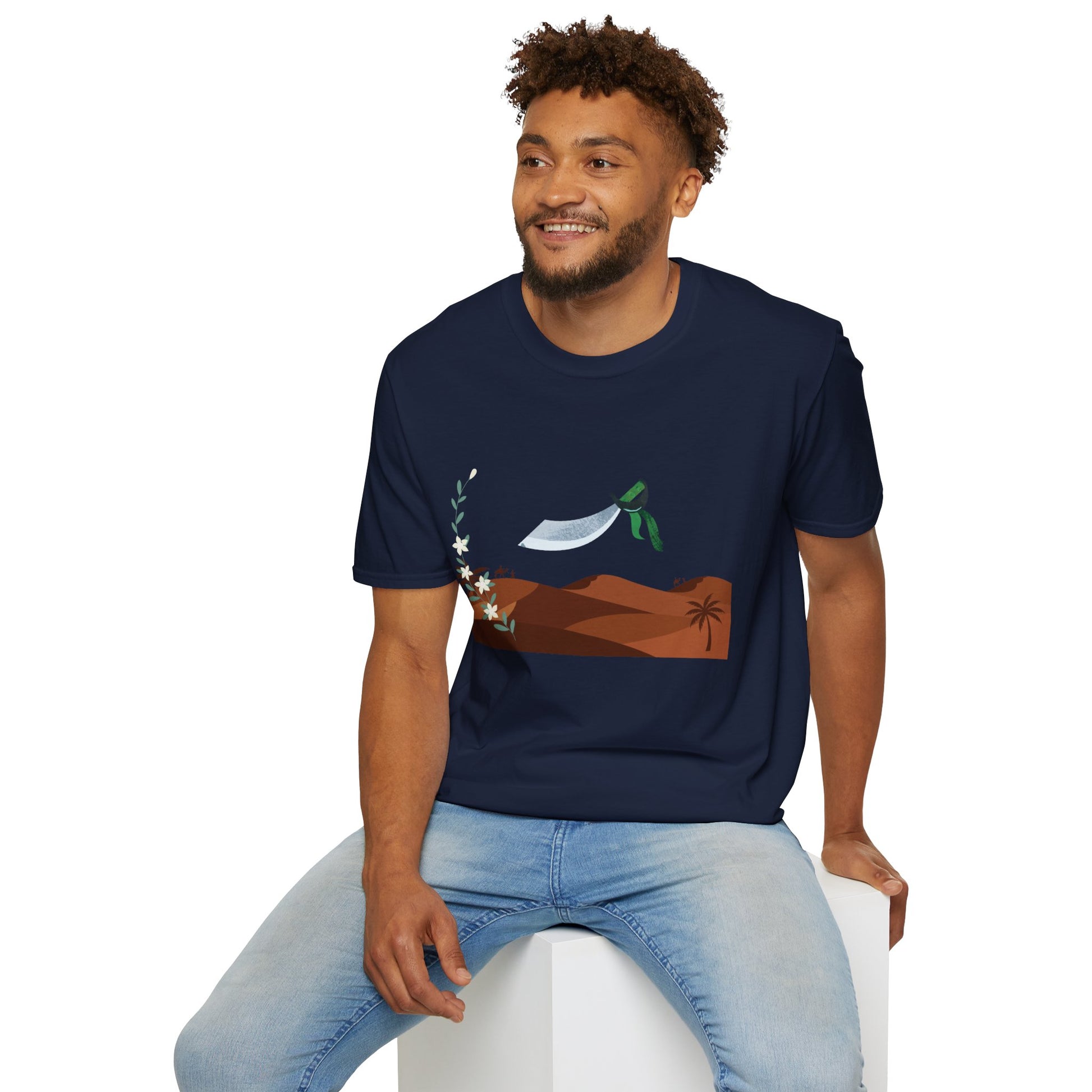 A part of the warrior-poet collection. In honor of the fabled Arabian warriors who once roamed the desert sands, this soft crewneck tee features the famed alfanje scimitar sword and coffea arabica flowers. Crafted from 100% ring-spun cotton, it offers a lightweight and blissful wearing experience for all-day comfort. The classic fit and crew neckline make it suitable for both casual outings and semi-formal events, allowing you to easily style it with your favorite jeans or skirts. Perfect for anyone who values comfort, quality, and style, this T-Shirt is especially relevant during holidays and celebrations like casual family gatherings, summer festivals, or just enjoying a relaxed day at home. Whether you're gifting it to a loved one or treating yourself, it embodies a laid-back yet chic vibe that fits seamlessly into any wardrobe.