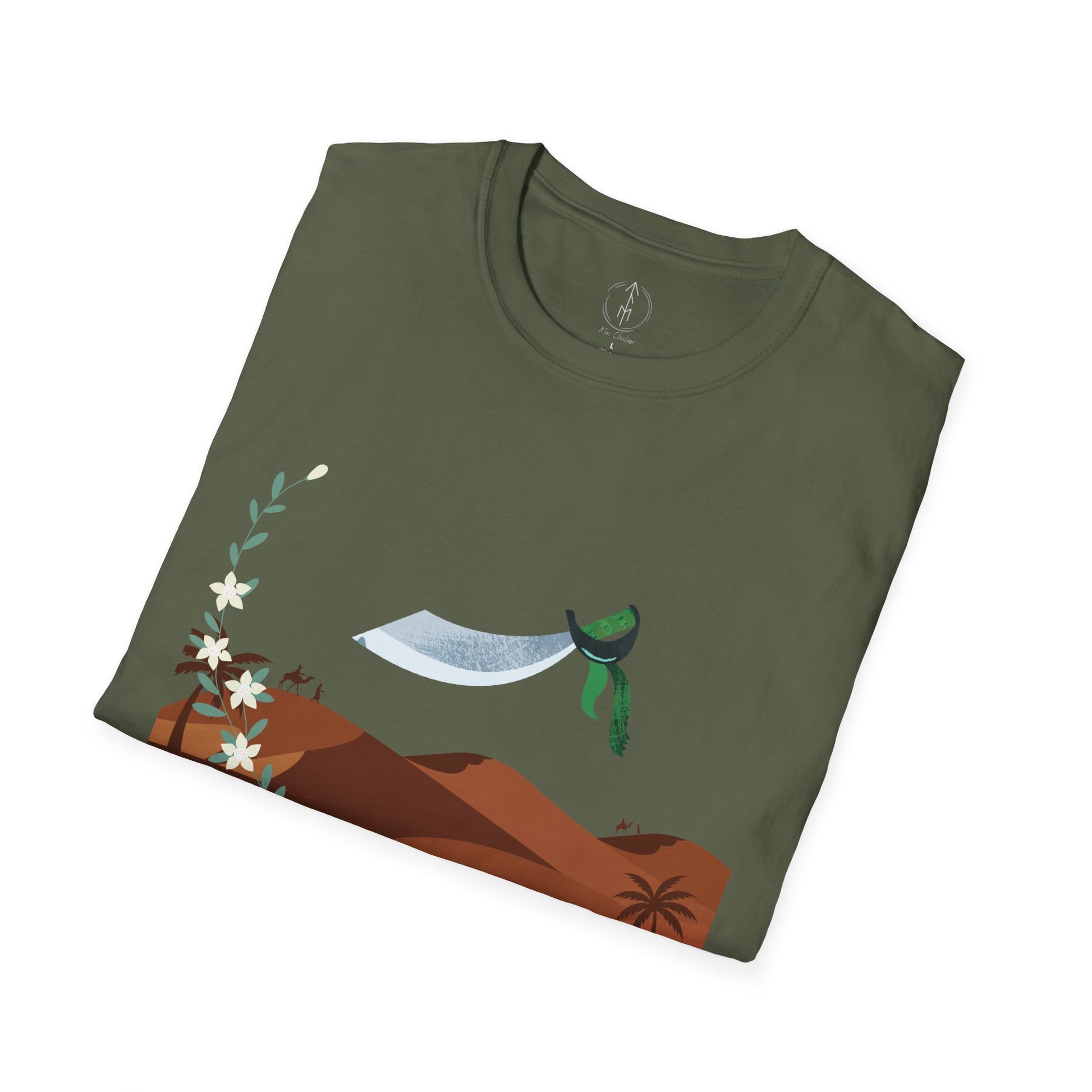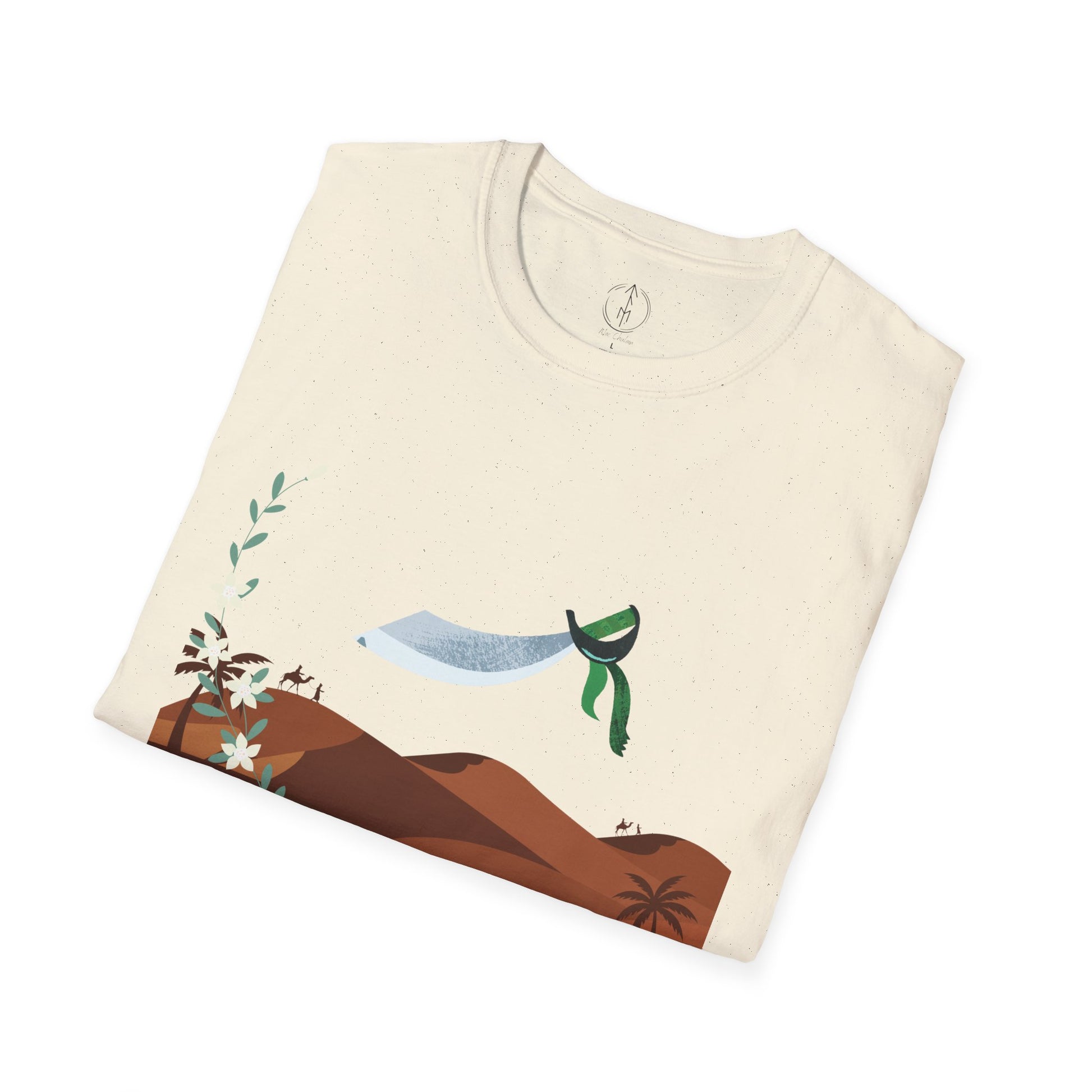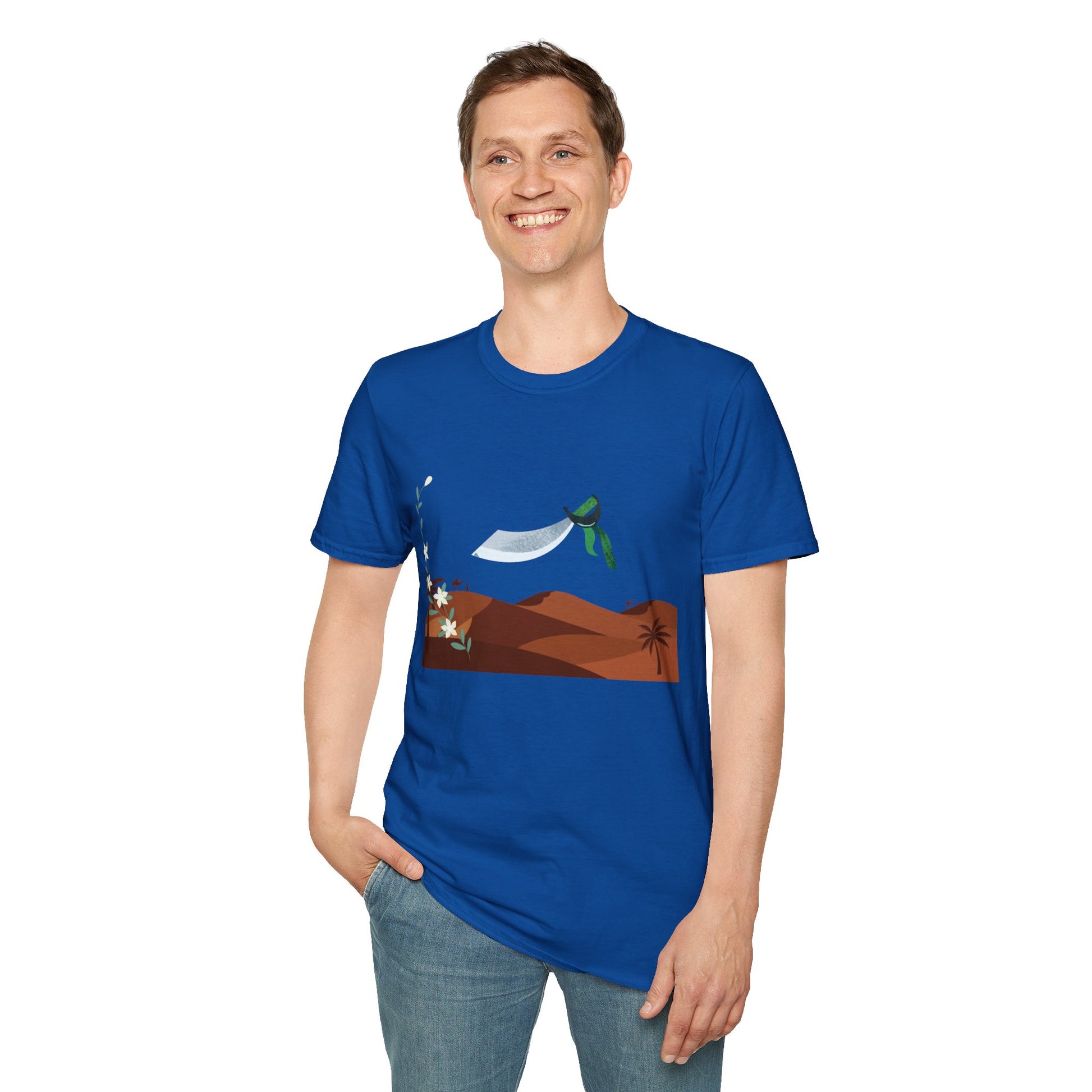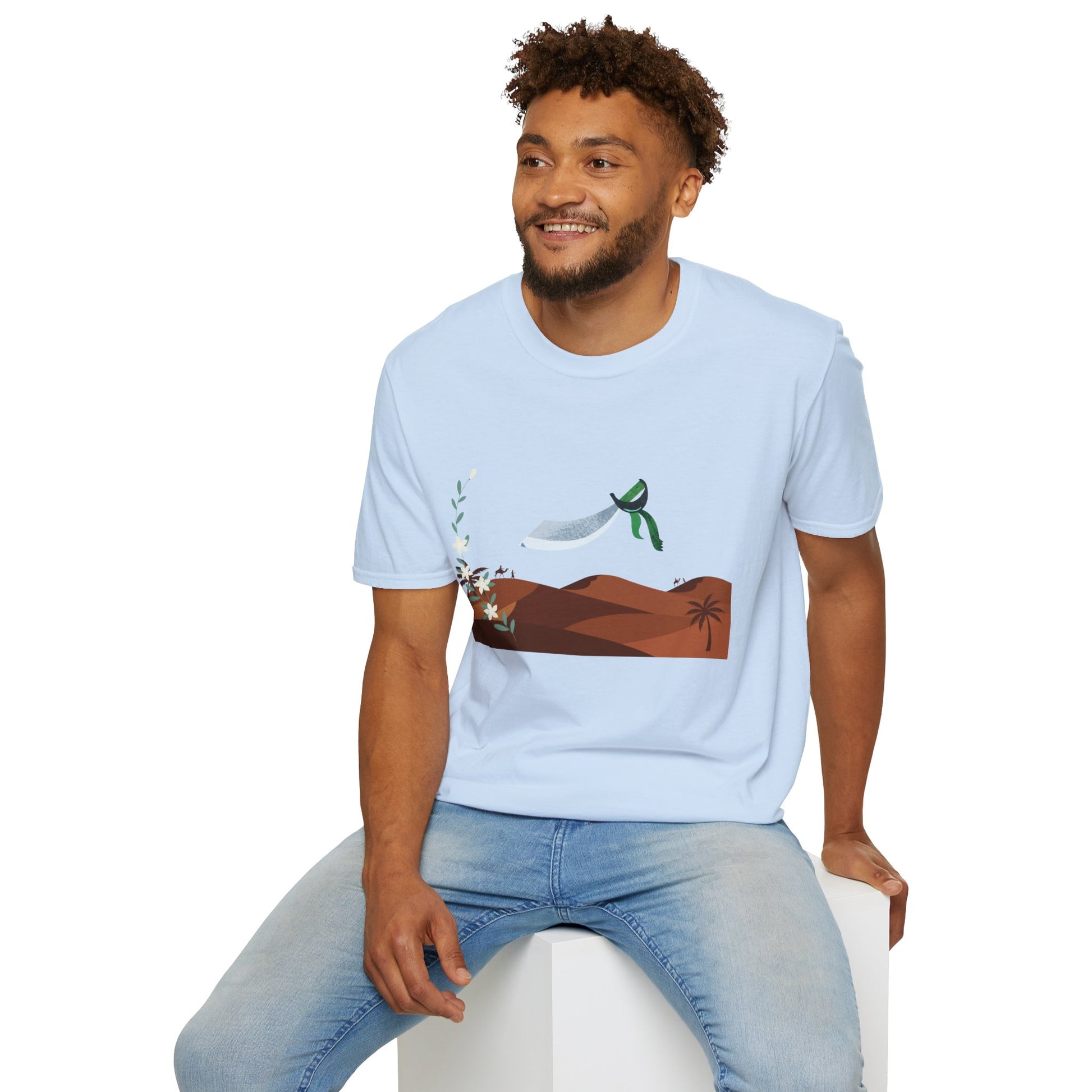 A part of the warrior-poet collection. In honor of the fabled Arabian warriors who once roamed the desert sands, this soft crewneck tee features the famed alfanje scimitar sword and coffea arabica flowers. Crafted from 100% ring-spun cotton, it offers a lightweight and blissful wearing experience for all-day comfort. The classic fit and crew neckline make it suitable for both casual outings and semi-formal events, allowing you to easily style it with your favorite jeans or skirts. Perfect for anyone who values comfort, quality, and style, this T-Shirt is especially relevant during holidays and celebrations like casual family gatherings, summer festivals, or just enjoying a relaxed day at home. Whether you're gifting it to a loved one or treating yourself, it embodies a laid-back yet chic vibe that fits seamlessly into any wardrobe.