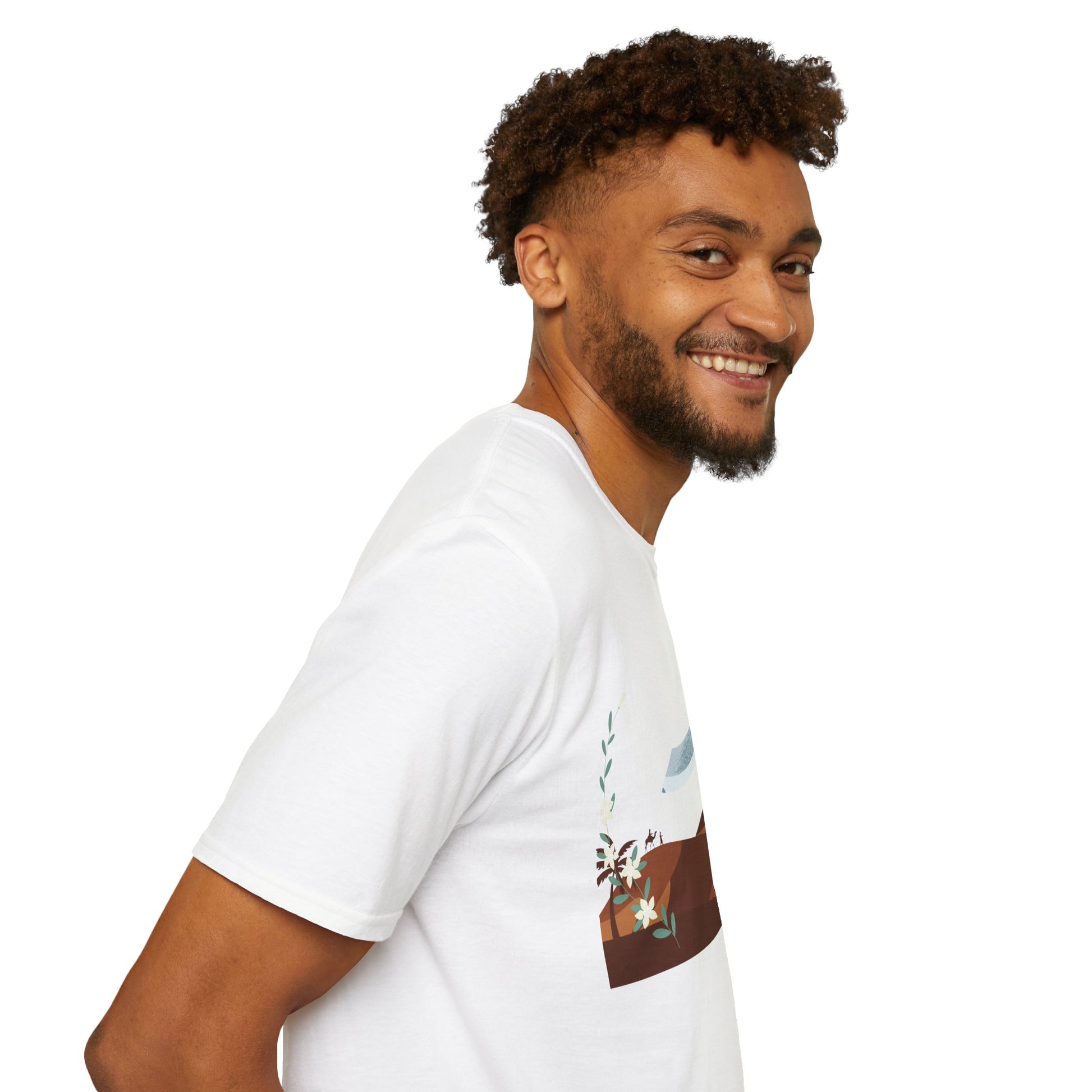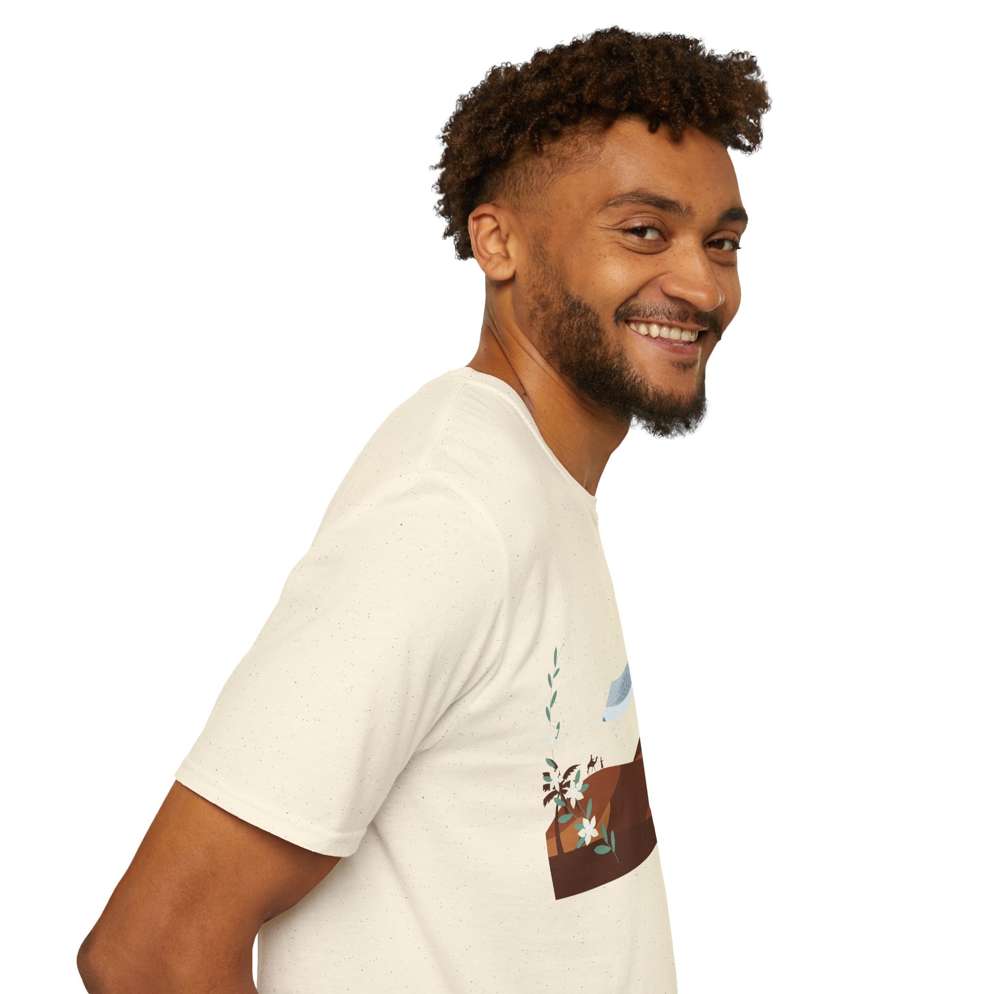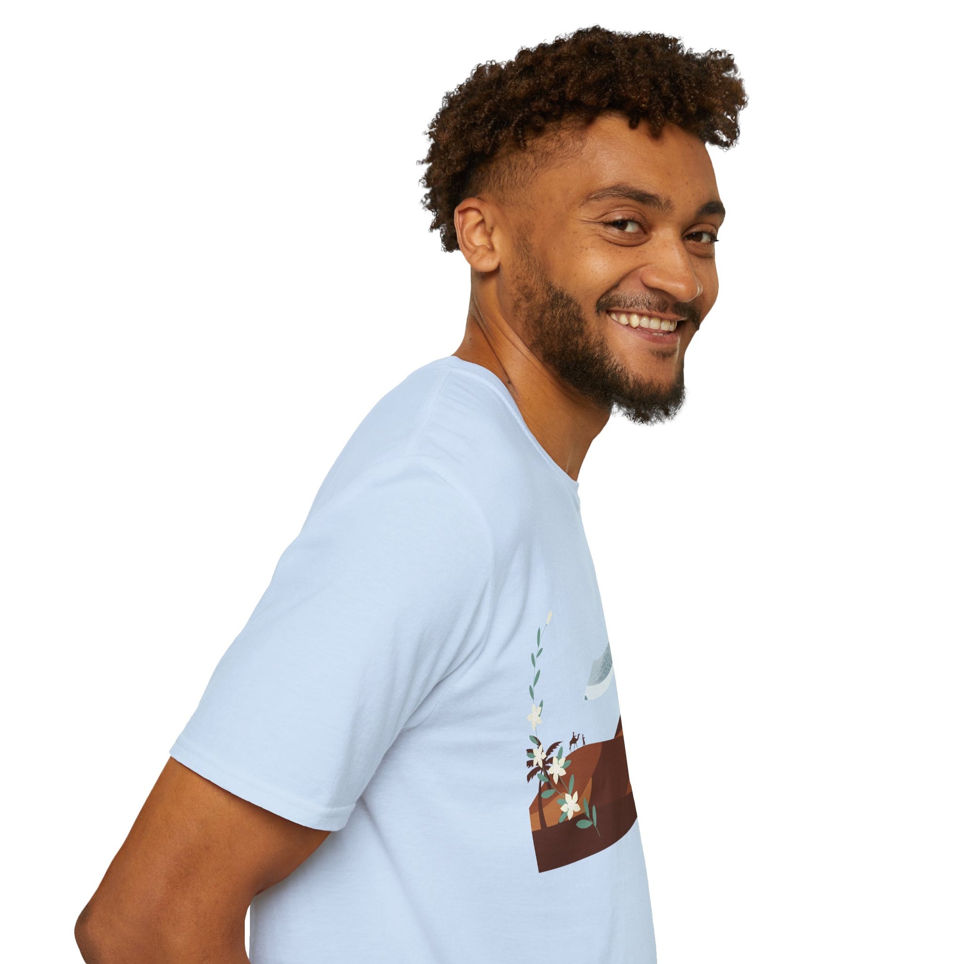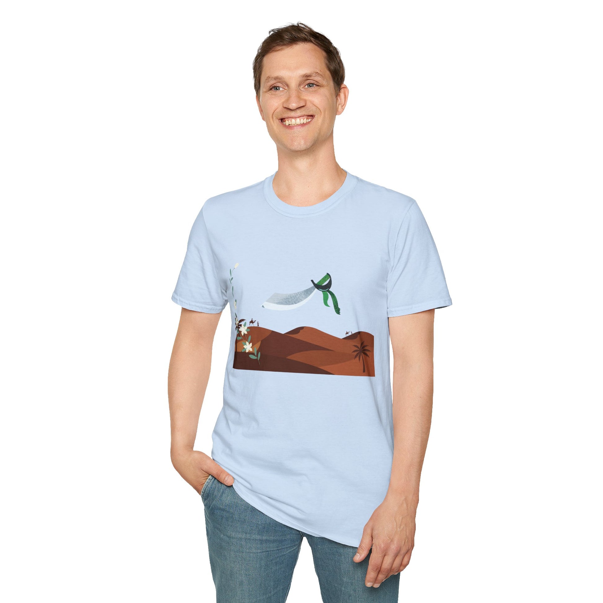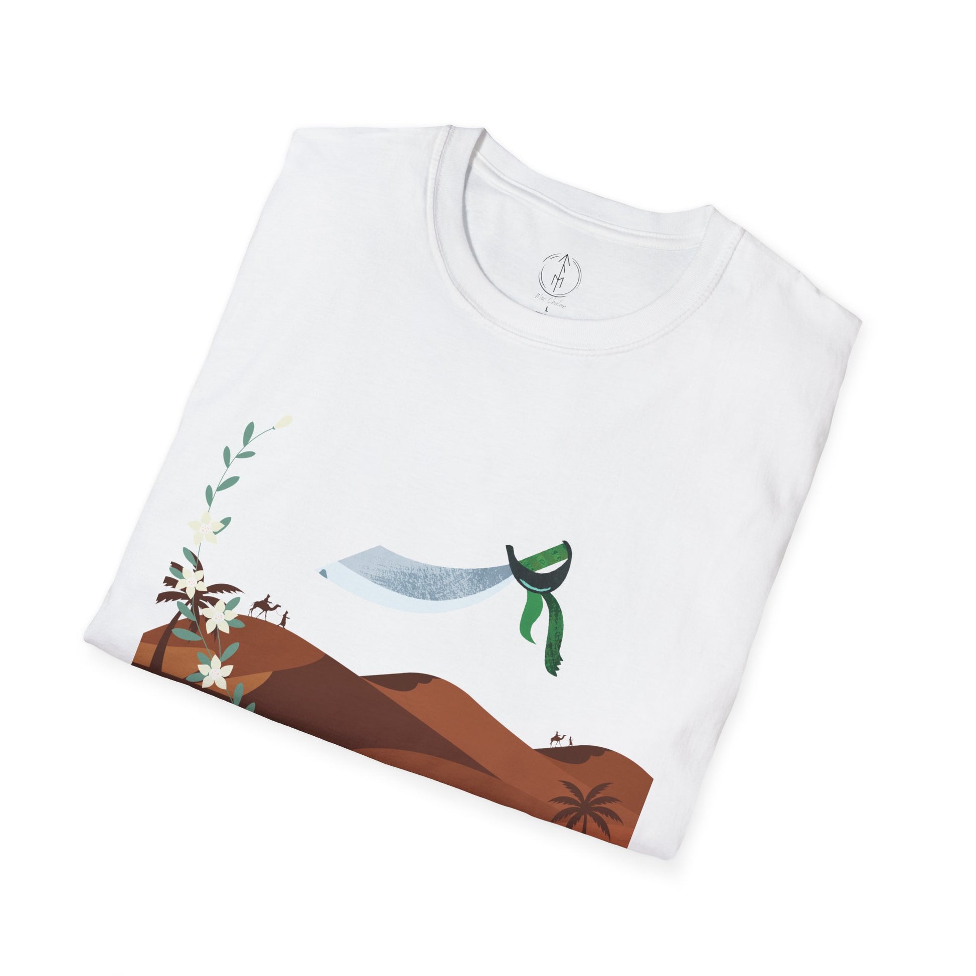 A part of the warrior-poet collection. In honor of the fabled Arabian warriors who once roamed the desert sands, this soft crewneck tee features the famed alfanje scimitar sword and coffea arabica flowers. Crafted from 100% ring-spun cotton, it offers a lightweight and blissful wearing experience for all-day comfort. The classic fit and crew neckline make it suitable for both casual outings and semi-formal events, allowing you to easily style it with your favorite jeans or skirts. Perfect for anyone who values comfort, quality, and style, this T-Shirt is especially relevant during holidays and celebrations like casual family gatherings, summer festivals, or just enjoying a relaxed day at home. Whether you're gifting it to a loved one or treating yourself, it embodies a laid-back yet chic vibe that fits seamlessly into any wardrobe.