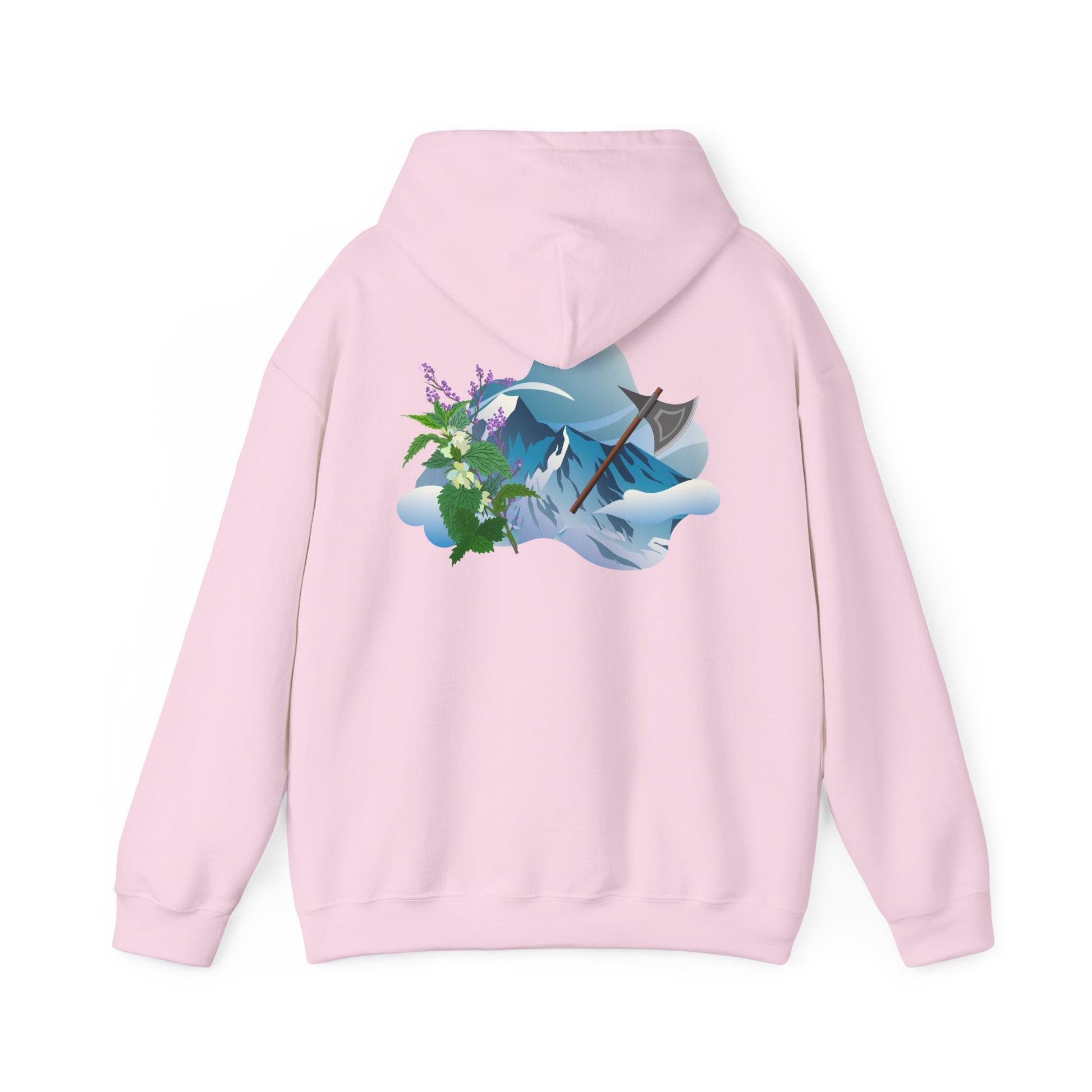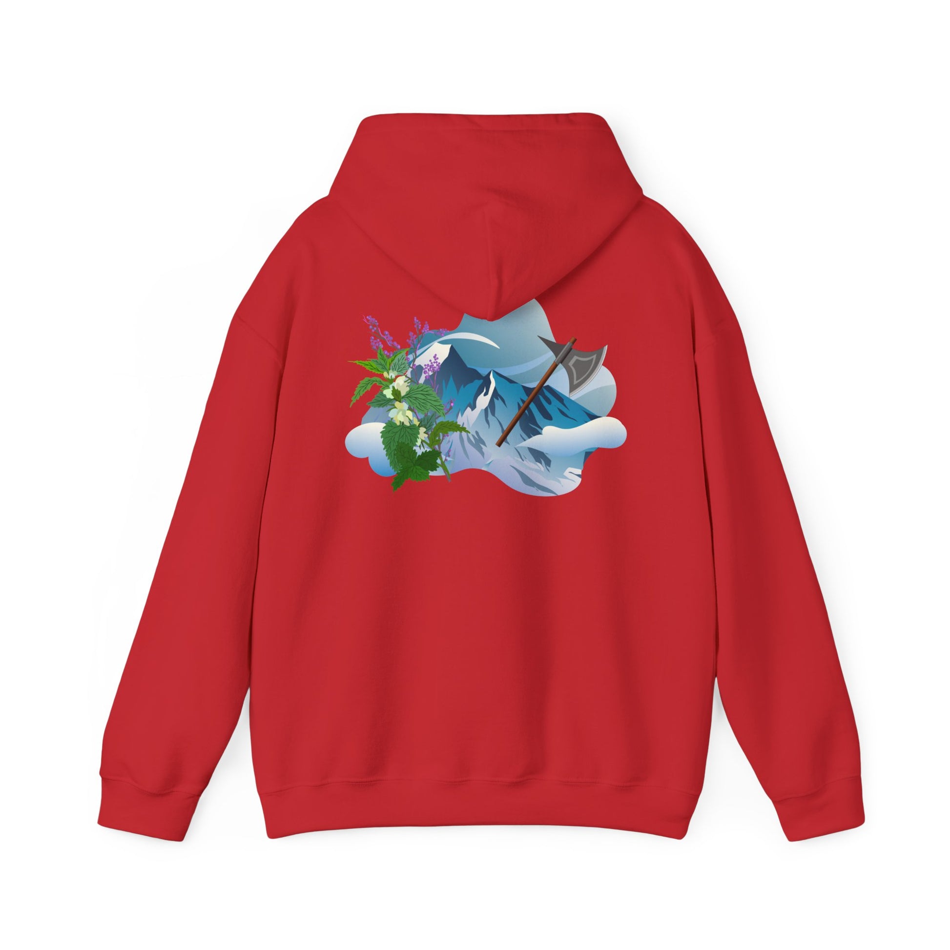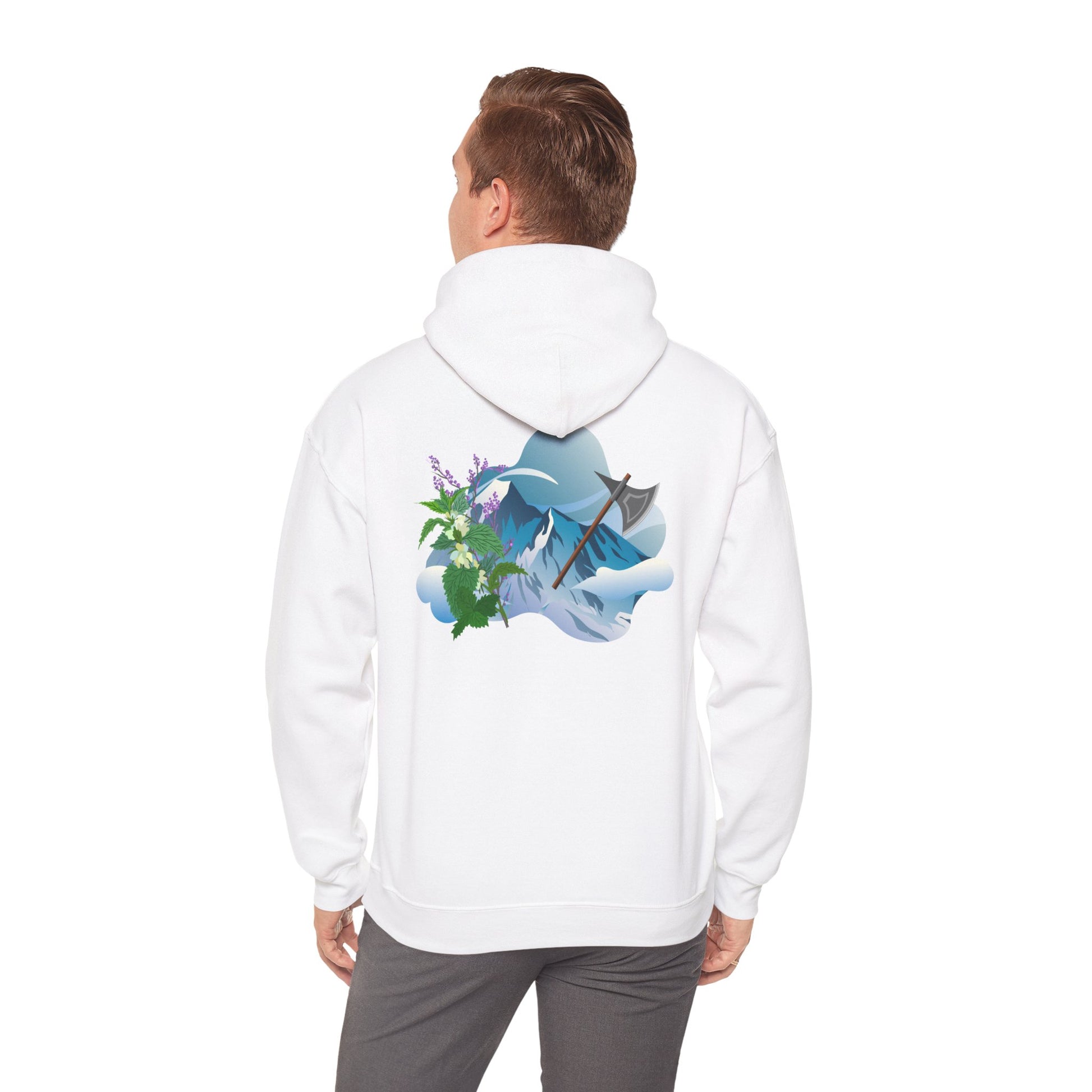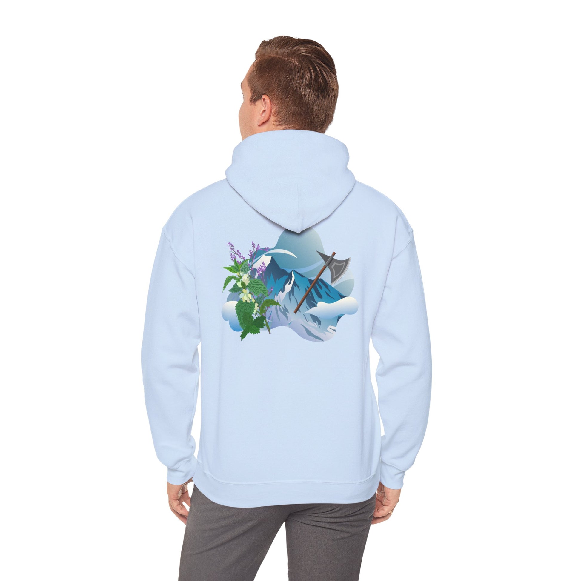 Inspired by the Volsunga Saga, which was based on the epic poetry of the historic Elder Edda, the Mountain Carver depicts snowy scandinavian peaks, featuring a dane axe with a bouquet of nettle and heather.