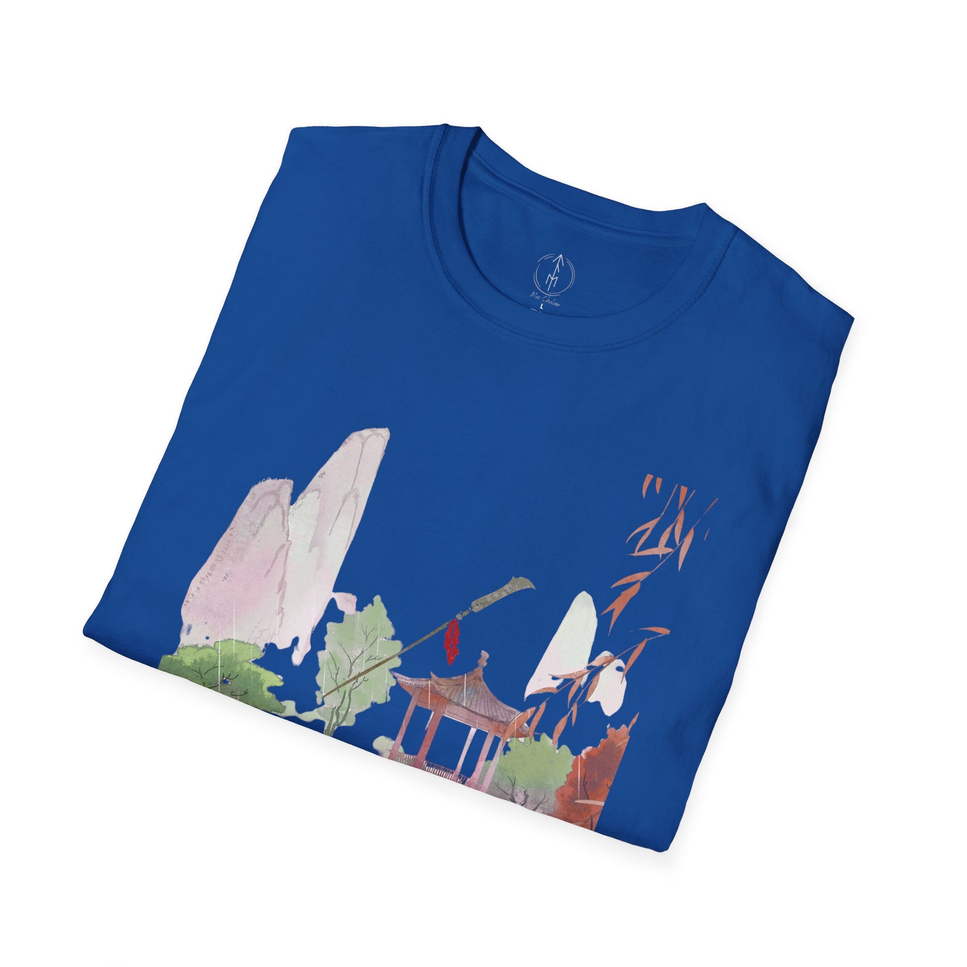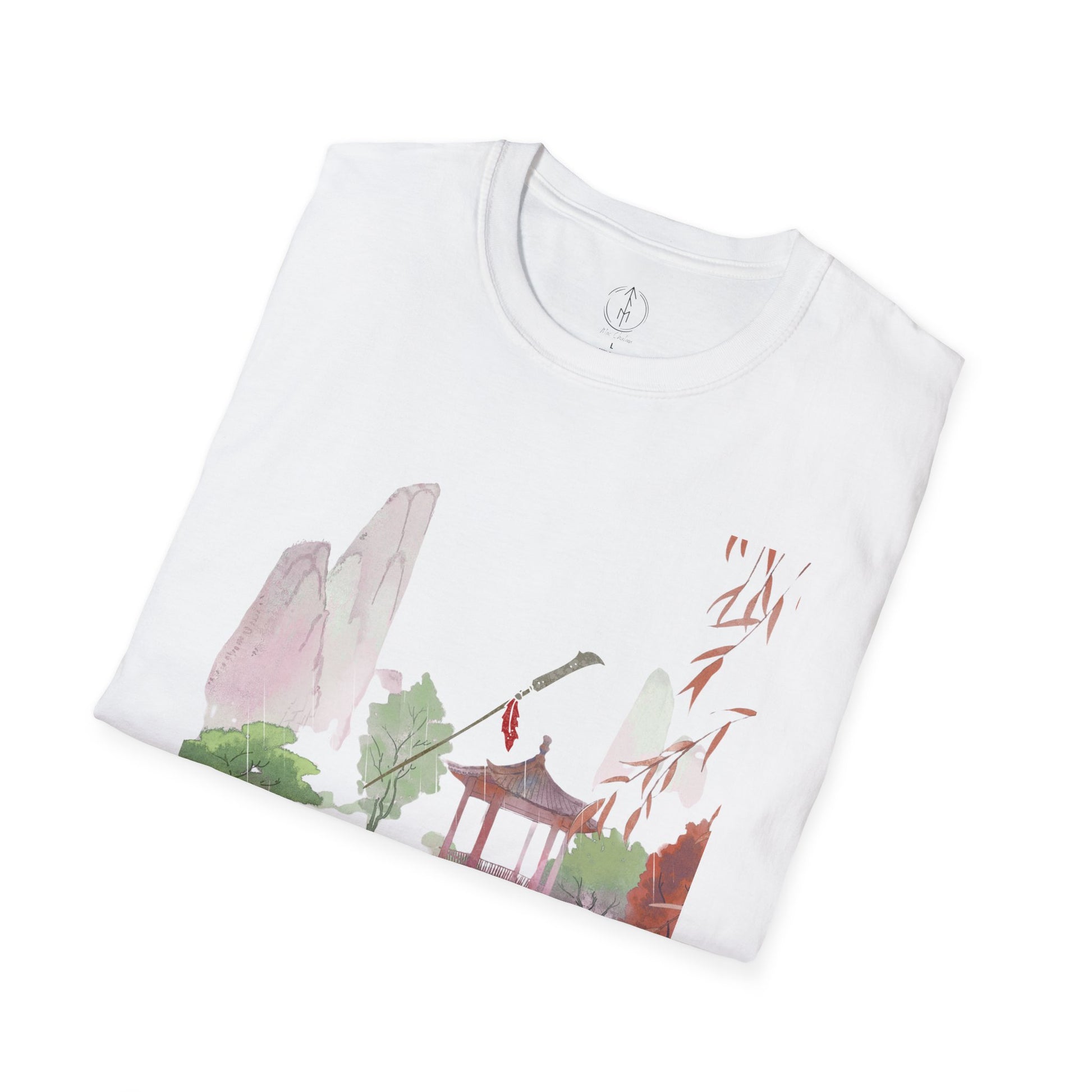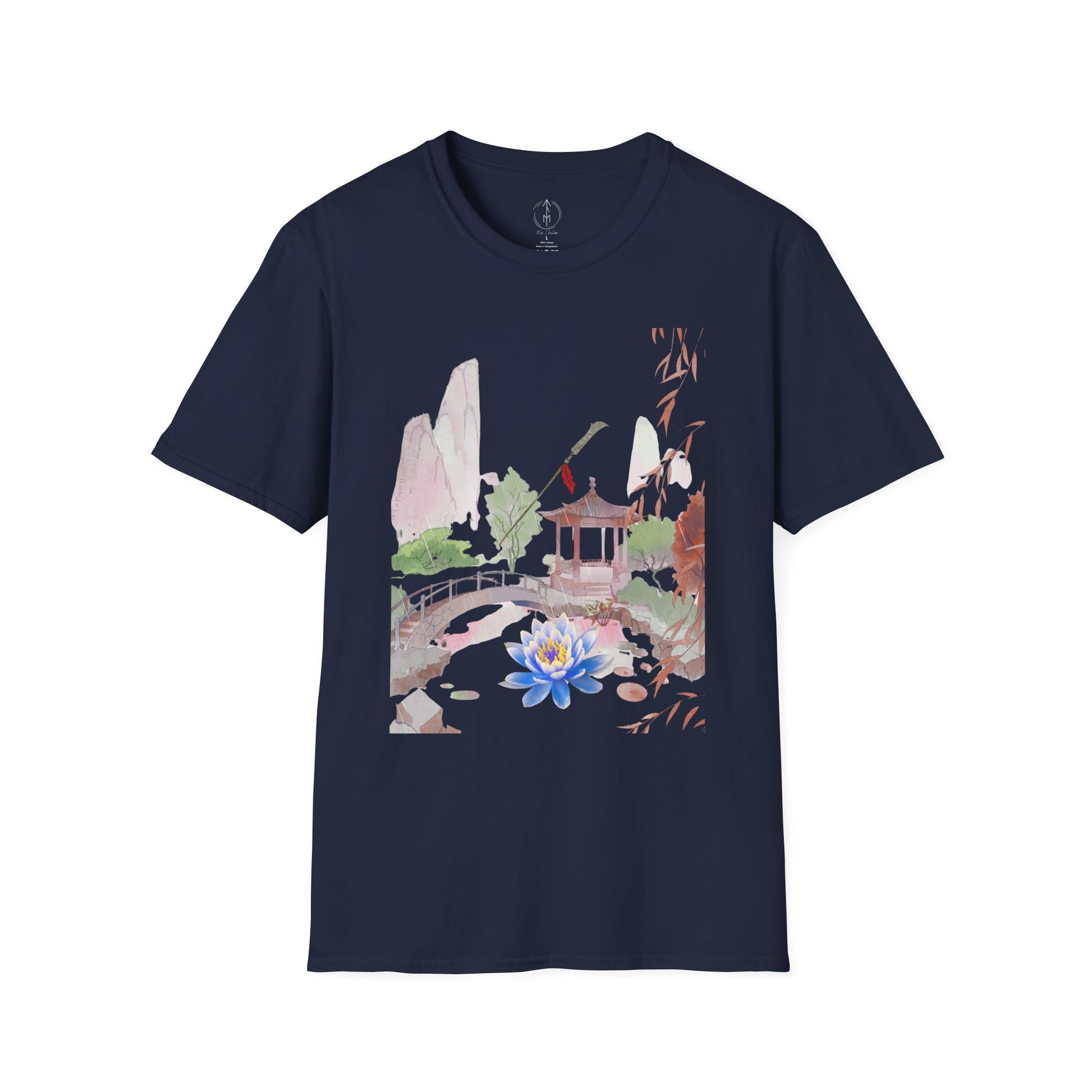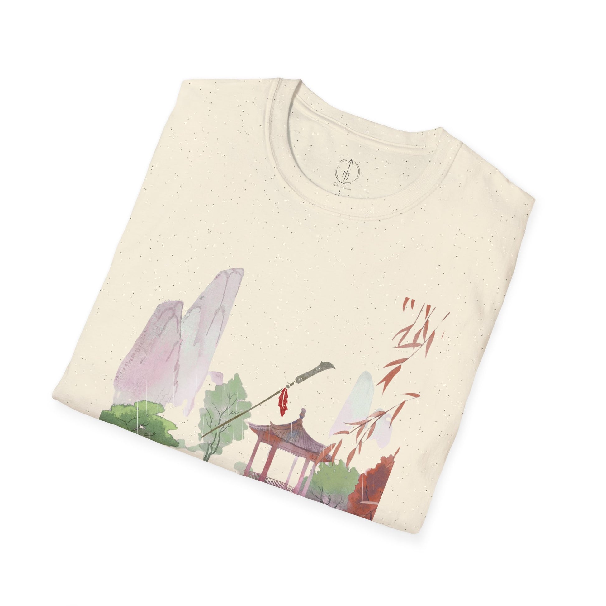 A part of the Warrior-Poet collection, this soft crewneck tee depicts a Chinese meditation garden, complete with a pavillion and a natural skyscraper mountain. It features the fabled Guandao, inspired by the legendary General Guan Yu's Green Dragon, and a blue lotus. The Three Kingdoms period of ancient China is one of the most retold stories of honorable warriors and fantastical poetry. The history of China is woven into a beautiful tapestry that continues to inspire as the ages pass.