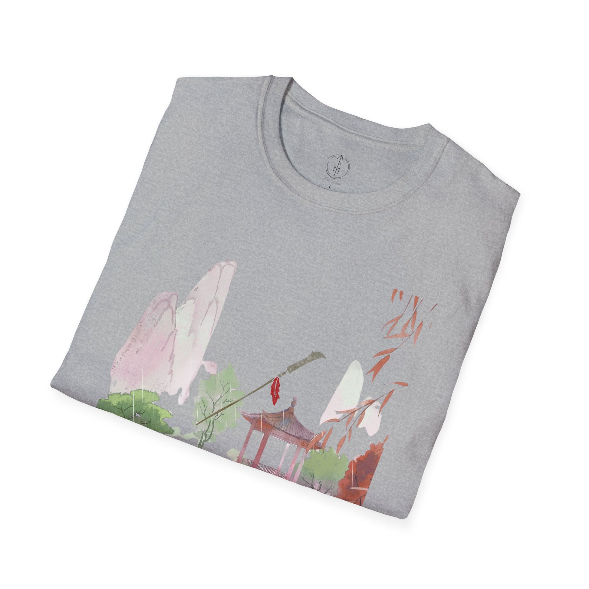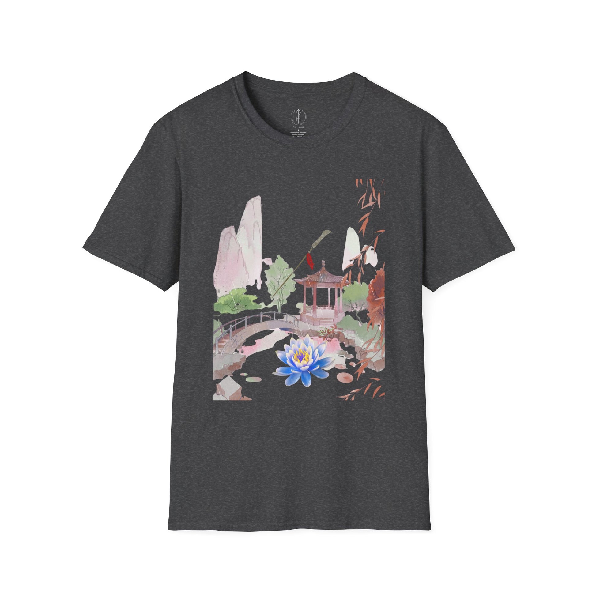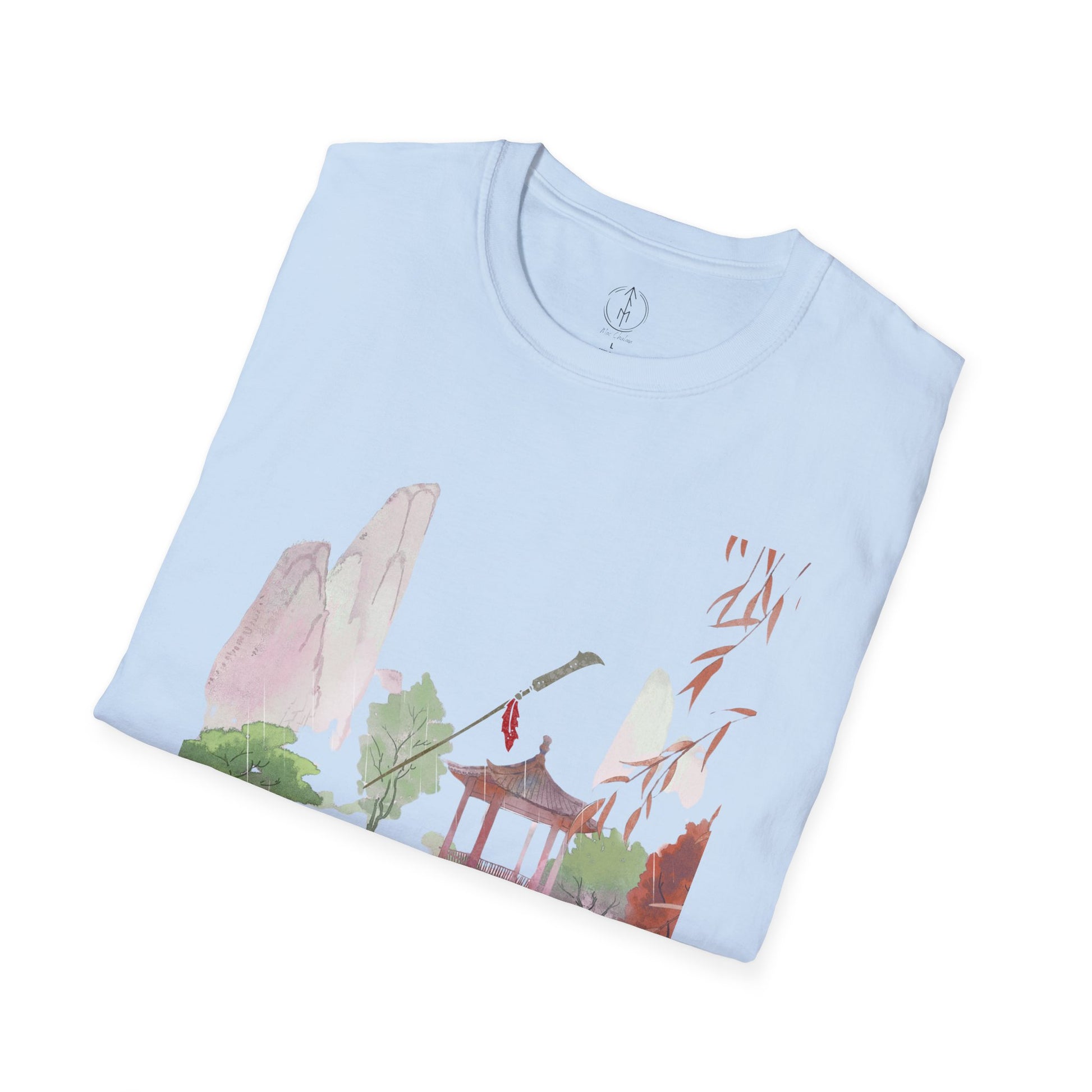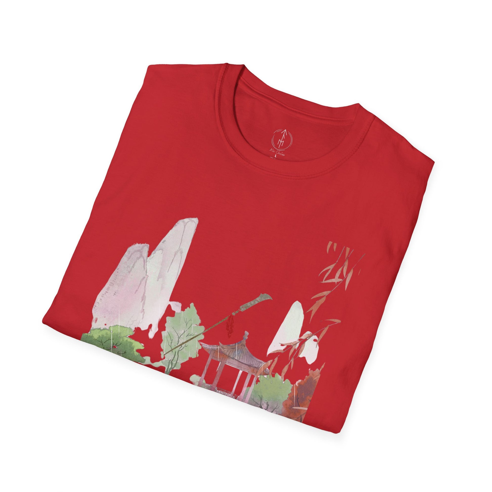 A part of the Warrior-Poet collection, this soft crewneck tee depicts a Chinese meditation garden, complete with a pavillion and a natural skyscraper mountain. It features the fabled Guandao, inspired by the legendary General Guan Yu's Green Dragon, and a blue lotus. The Three Kingdoms period of ancient China is one of the most retold stories of honorable warriors and fantastical poetry. The history of China is woven into a beautiful tapestry that continues to inspire as the ages pass.