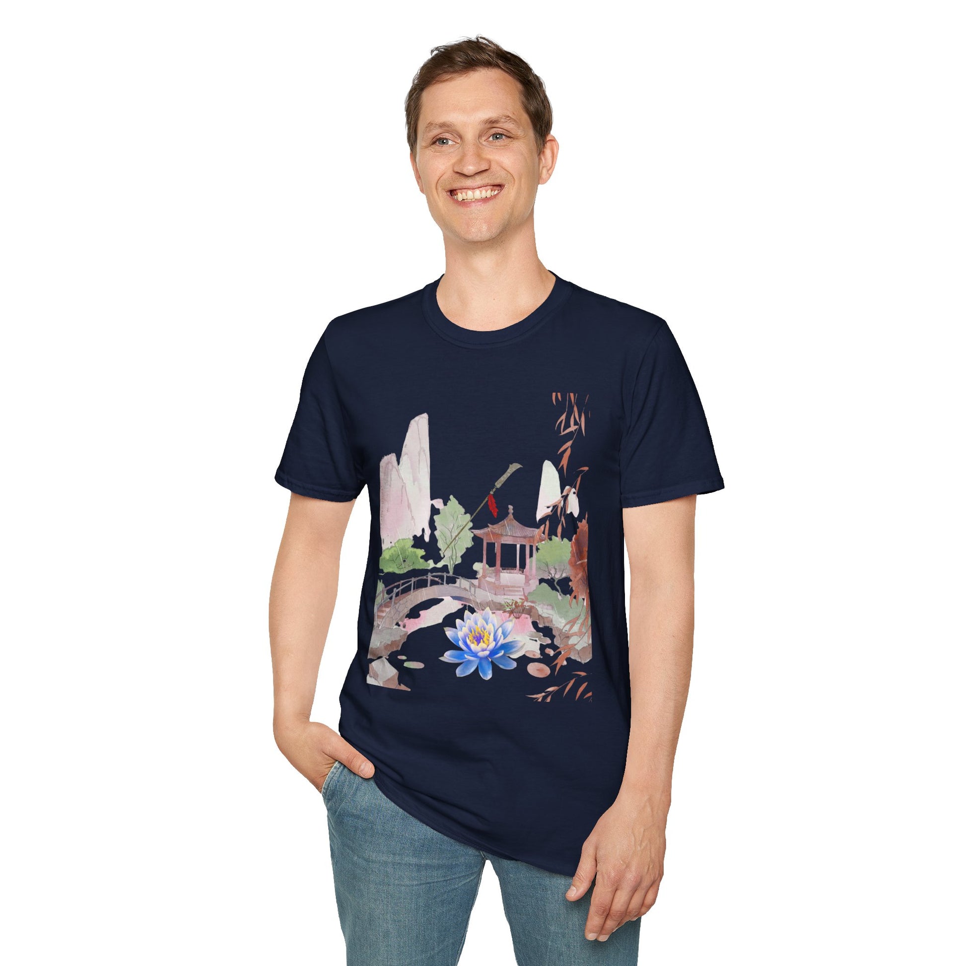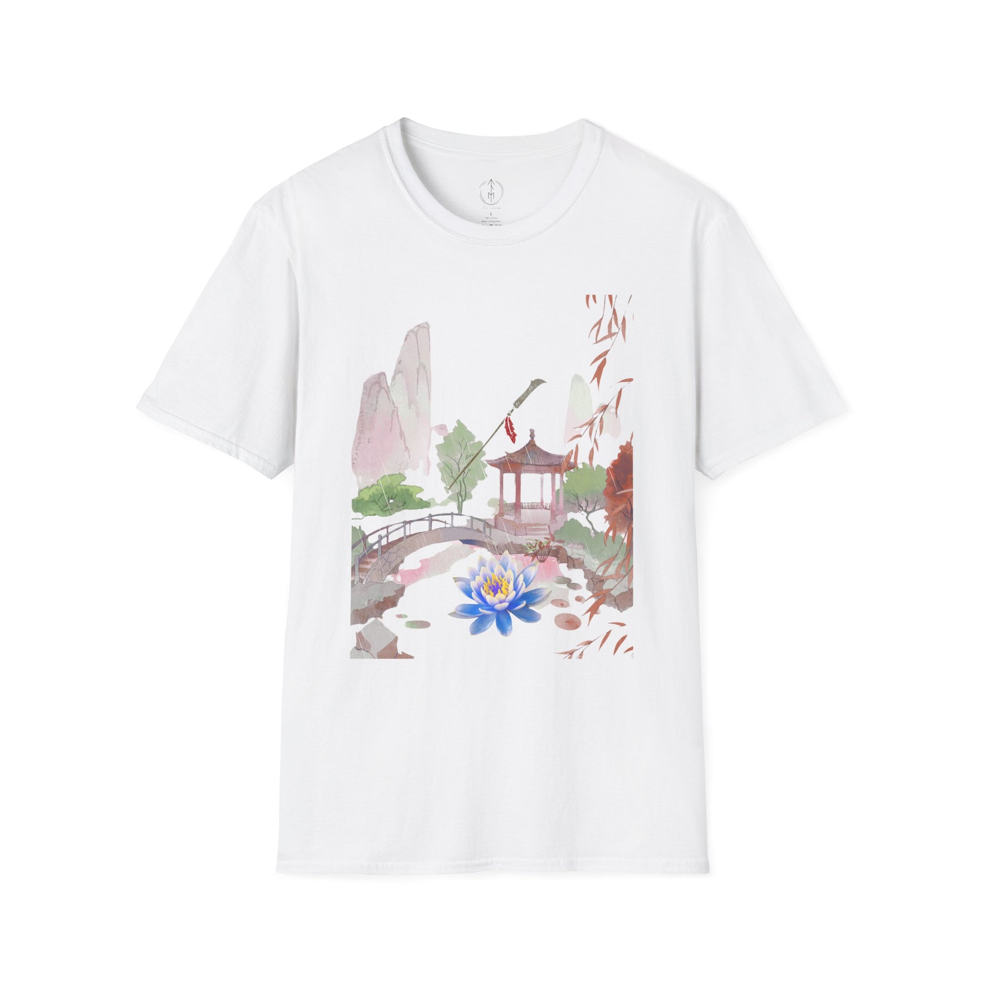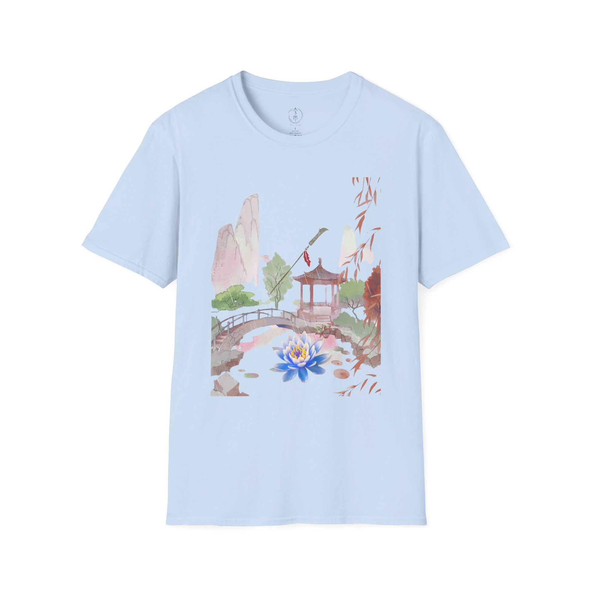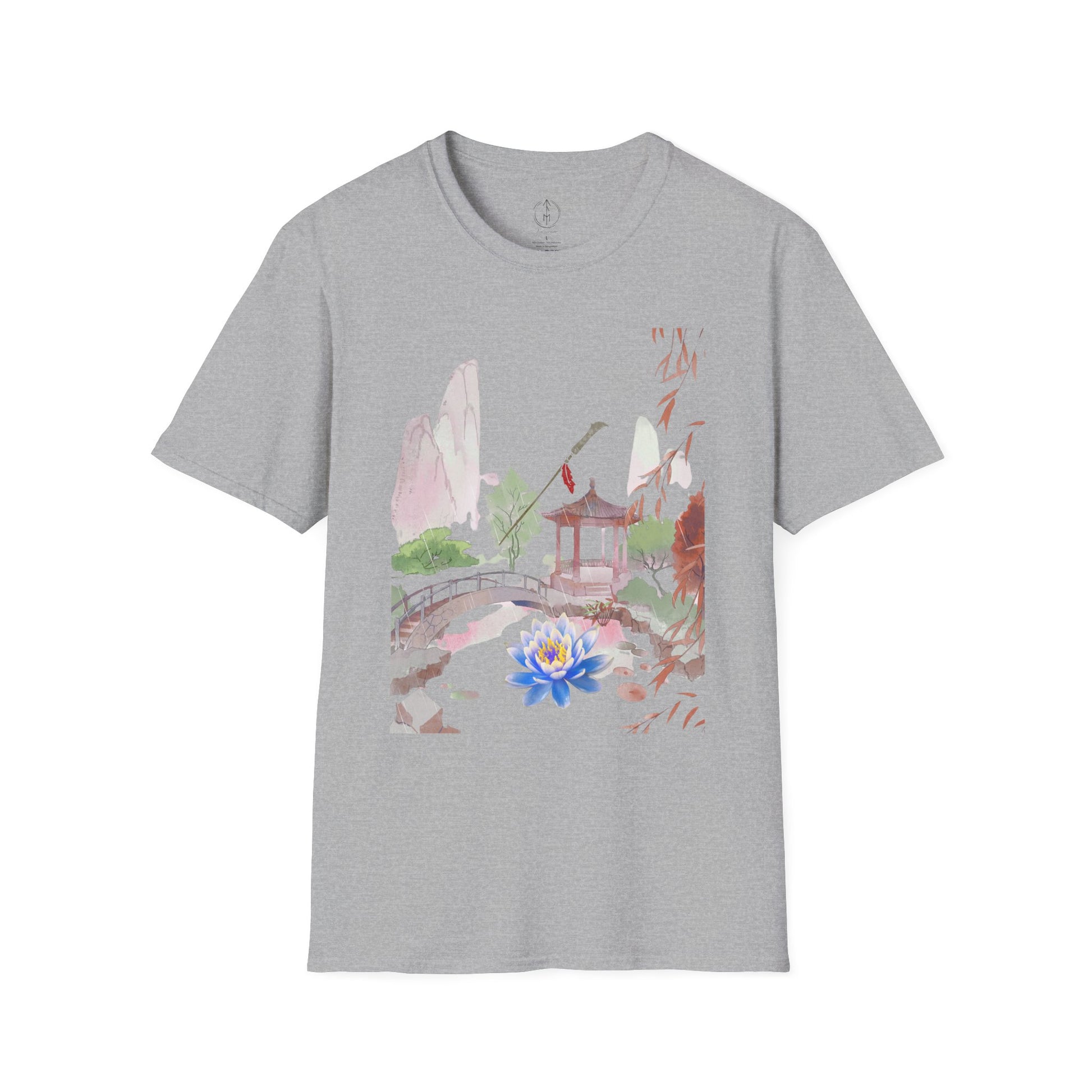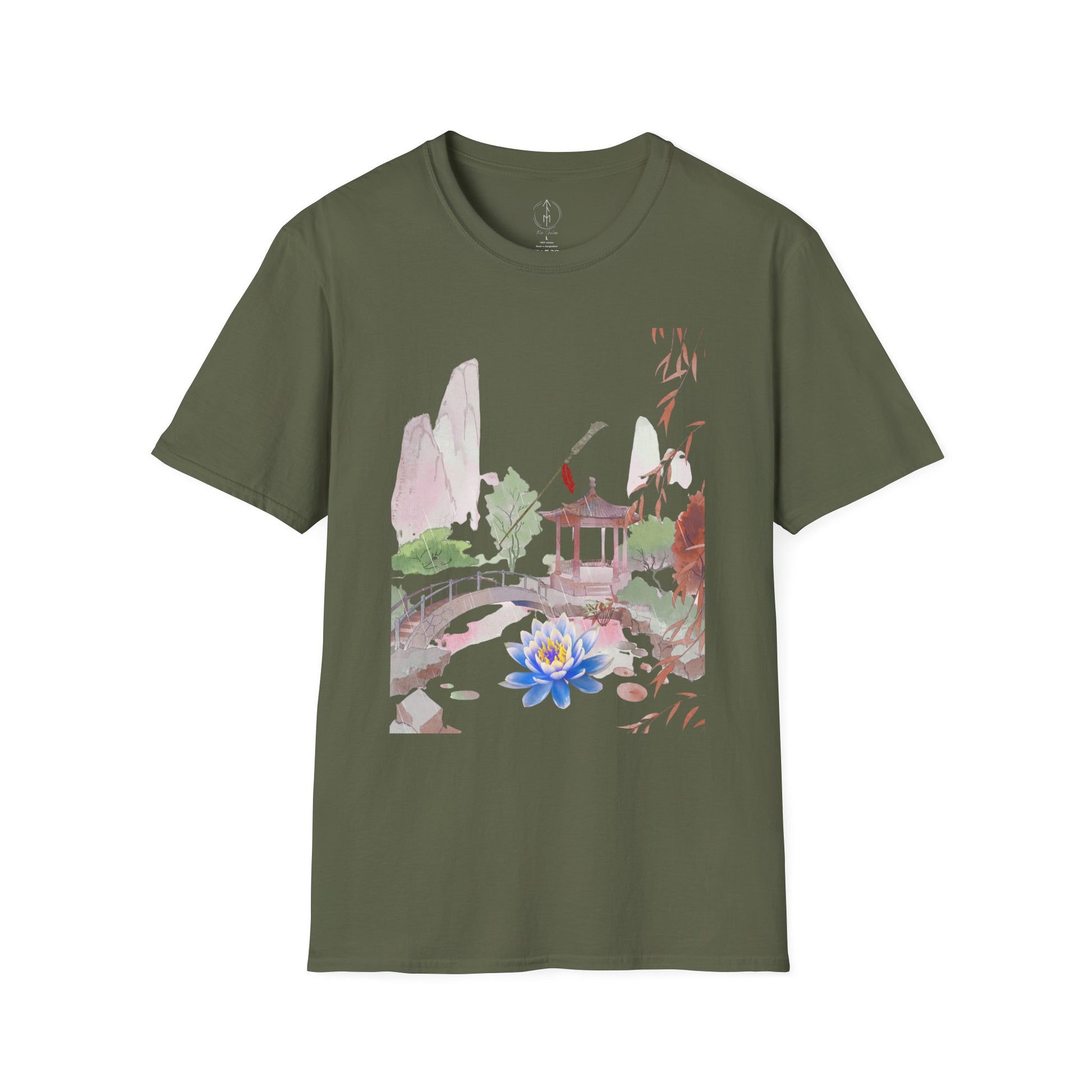 A part of the Warrior-Poet collection, this soft crewneck tee depicts a Chinese meditation garden, complete with a pavillion and a natural skyscraper mountain. It features the fabled Guandao, inspired by the legendary General Guan Yu's Green Dragon, and a blue lotus. The Three Kingdoms period of ancient China is one of the most retold stories of honorable warriors and fantastical poetry. The history of China is woven into a beautiful tapestry that continues to inspire as the ages pass.