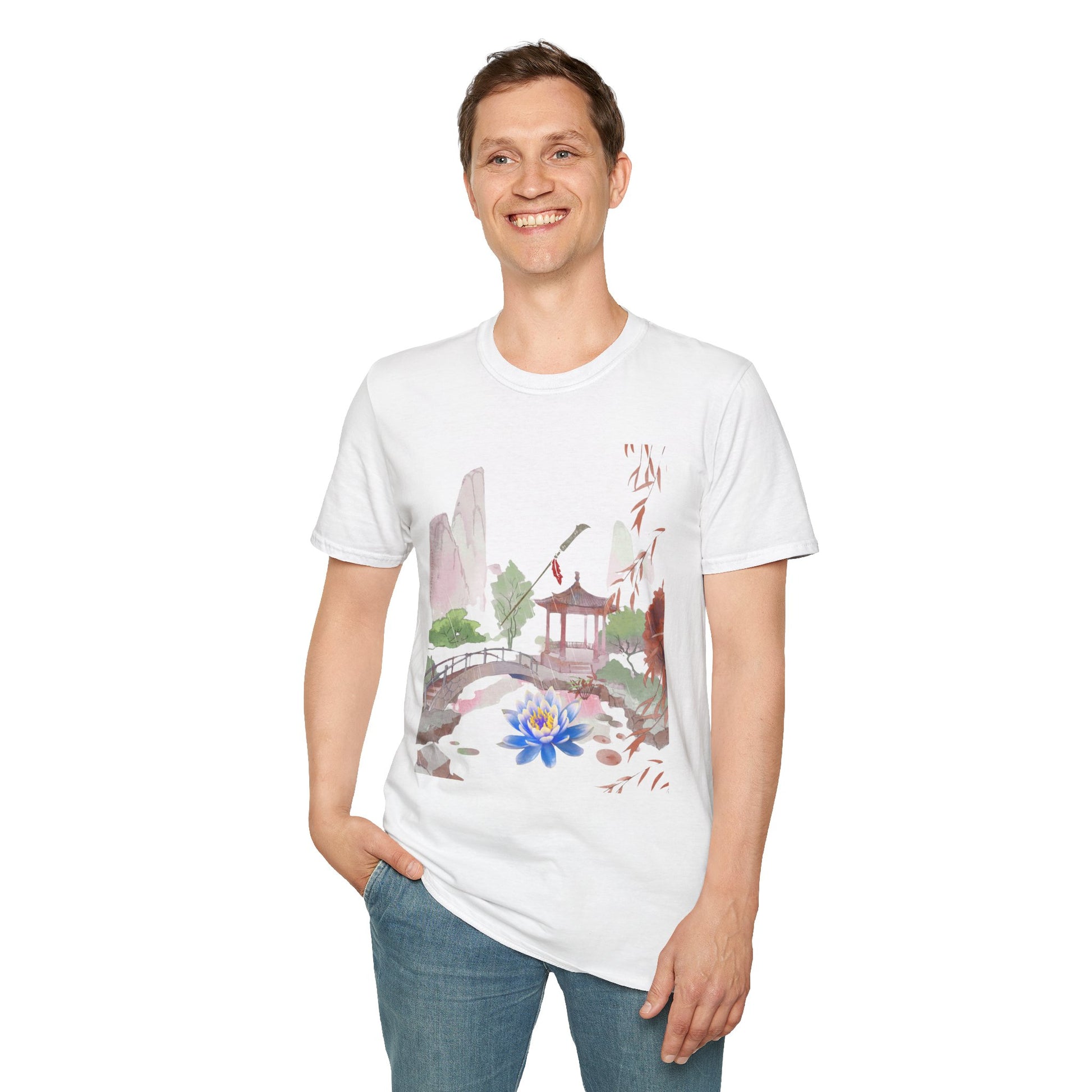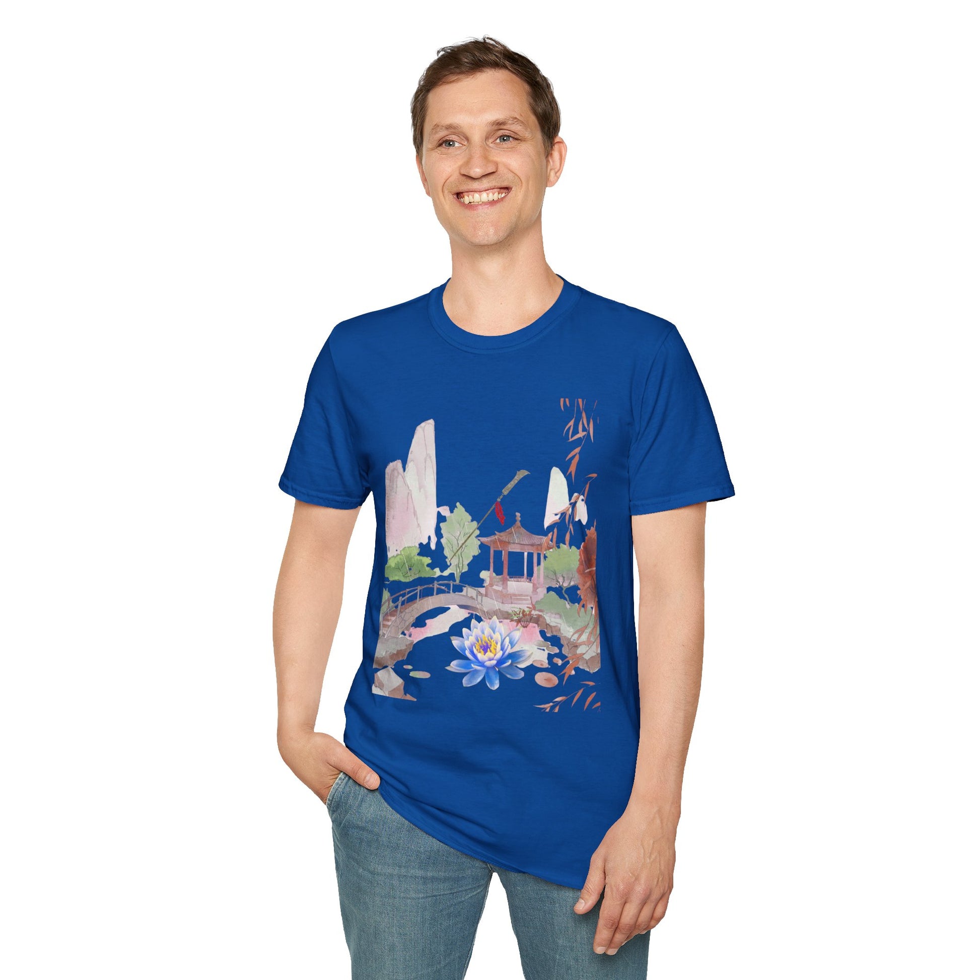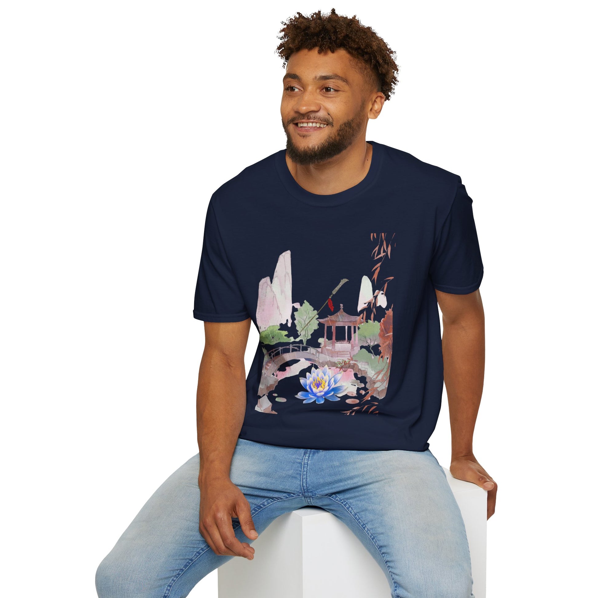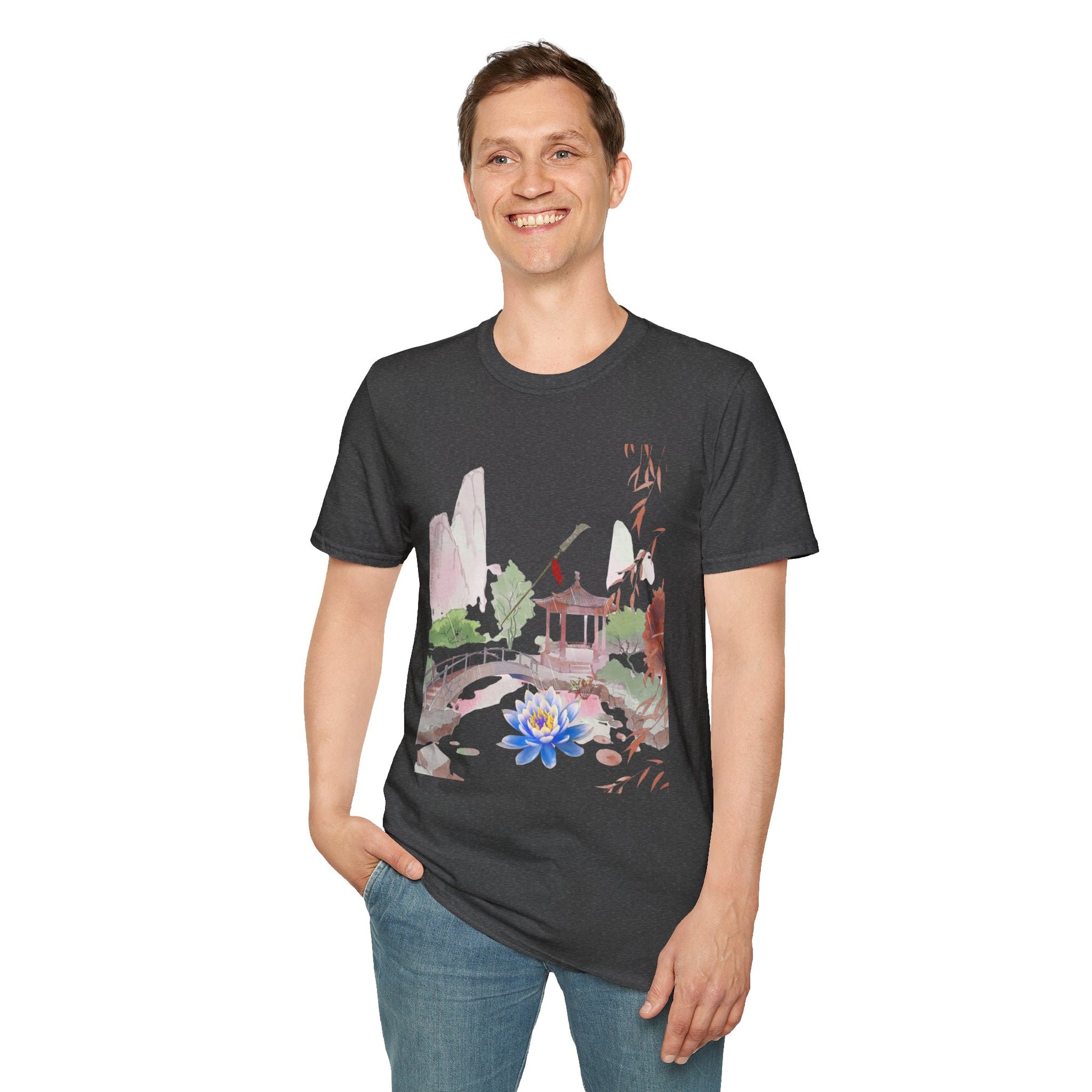 A part of the Warrior-Poet collection, this soft crewneck tee depicts a Chinese meditation garden, complete with a pavillion and a natural skyscraper mountain. It features the fabled Guandao, inspired by the legendary General Guan Yu's Green Dragon, and a blue lotus. The Three Kingdoms period of ancient China is one of the most retold stories of honorable warriors and fantastical poetry. The history of China is woven into a beautiful tapestry that continues to inspire as the ages pass.